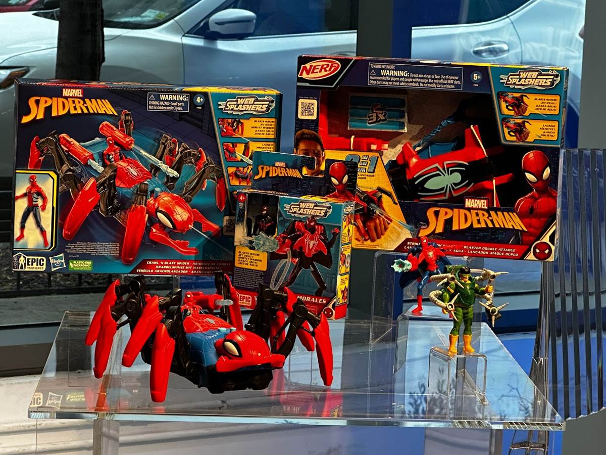 Currently available are new water-based Spider-Man toys known as Web Splashers. For ages 4 and up, the Spider-Man Crawl ‘N Blast Spider (MSRP: $54.99) comes with a 4-inch Spider-Man action figure and vehicle with 8 legs that move up and down as the wheels turn. It can blast web projectiles and also has pincers for capturing enemies. The spider’s head is detachable and can be filled with water, which can be squirted at the push of a button. For ages 5 and up is the Spider-Man Strike ‘N Splash Blaster (MSRP: $29.99), a wearable web shooter that first NERF darts and water.