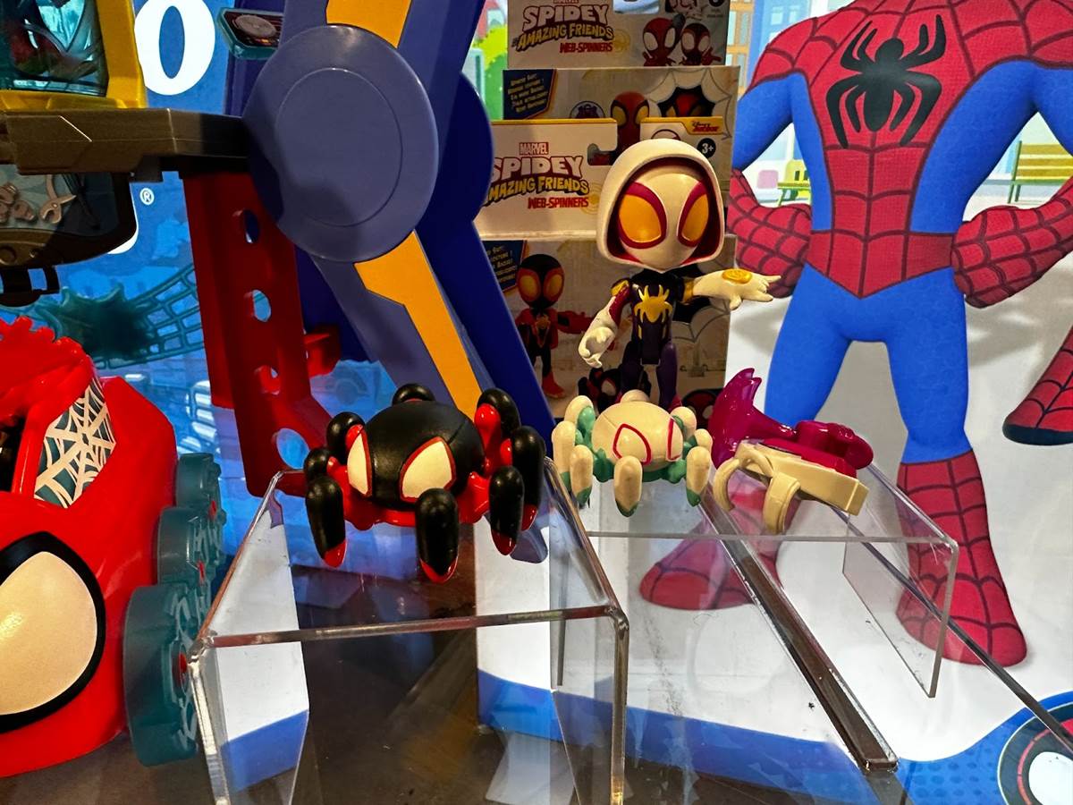 Web Spinners Action Figures (available in Spidey, Ghost, and Miles Morales) are 4-inch figures that each come with a sidekick bot, a backpack, and a web-spinning accessory (MSRP: $11.99). Also in the 4-inch line are action figures with spinner vehicles. These figures have a detachable helmet and the vehicles automatically spin when the wheels are rolled. Available in Spidey with Hover Spinner, Ghost-Spider with Glide Spinner, and Miles with Drill Spinner.