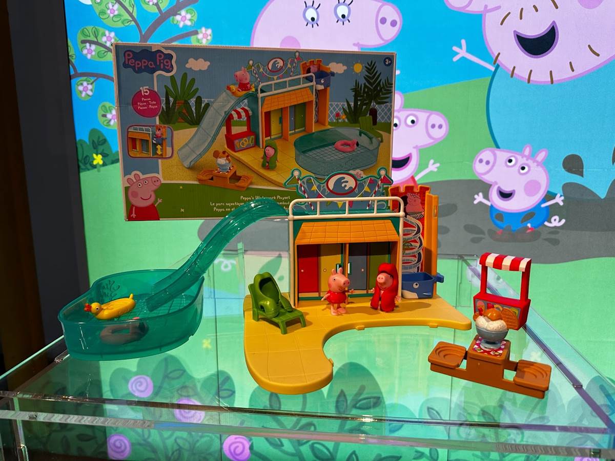 Peppa’s Waterpark Playset (Ages 3 and up, MSRP: $29.99) comes with figures of Peppa and George, who can be changed into their swimsuits. They can ride the slide on a flamingo floatie, which leads into the swimming pool. Comes with 15 pieces.