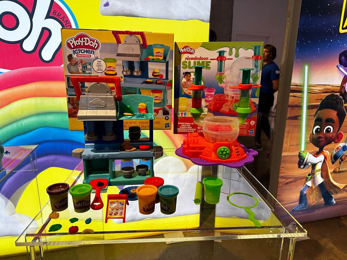 The Play-Doh Busy Chef’s Restaurant (Ages 3 and up, MSRP: $24.99) offers more pretend food play. Kids take over the kitchen at this establishment, using stampers to create pizza, burgers, pasta, and chicken. A lever allows them to speed up productivity by stamping two at a time. There’s even a menu board to add to the fun. Also on display was the Play-Doh Nickelodeon Slime Ultimate Bubble Lab (Ages 3 and up, MSRP: $24.99), which uses Nickelodeon Slime to create colorful bubbles without having to get gooey. A bubble wand lets them put on a show with their bubble slime creation.