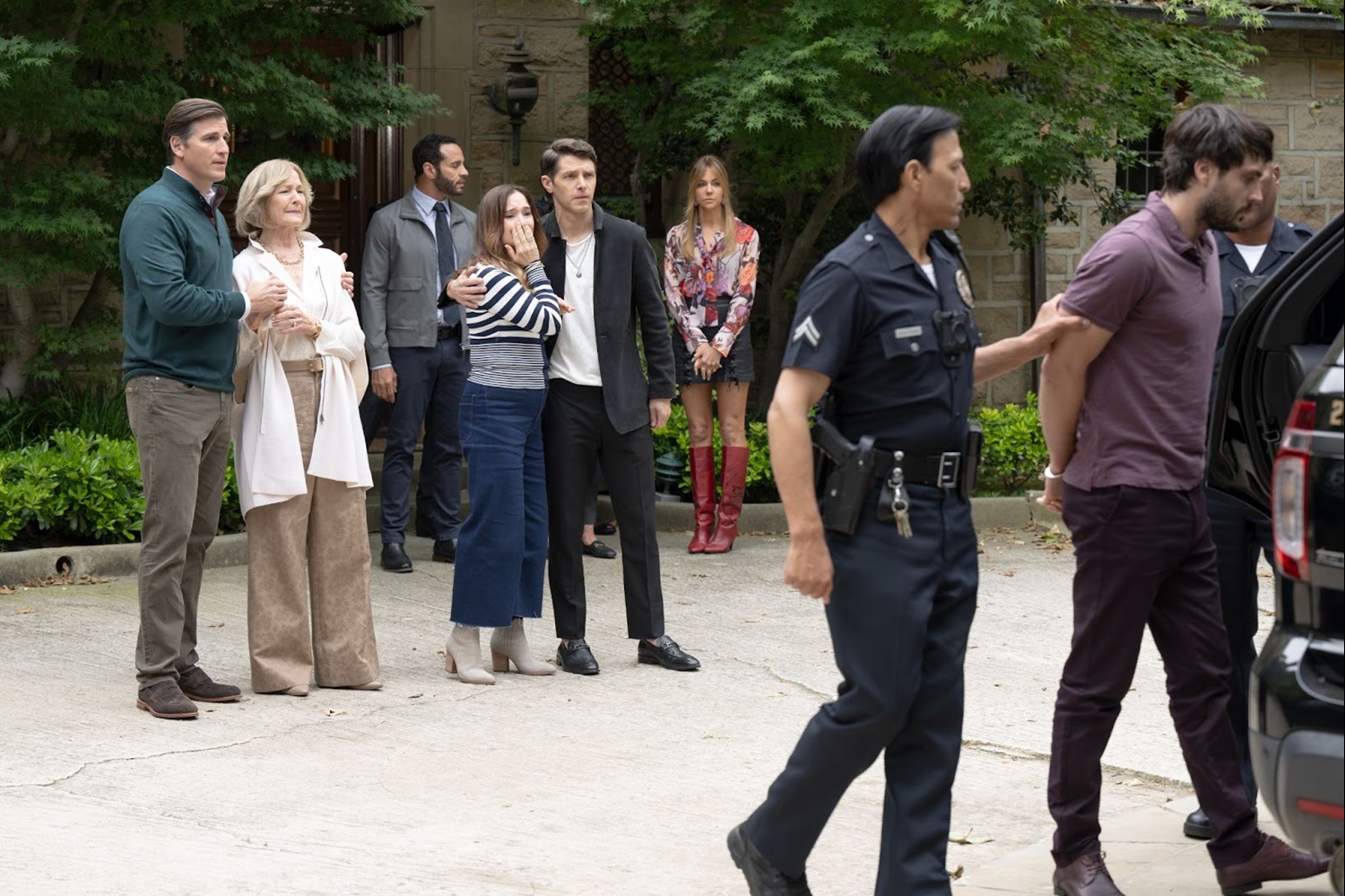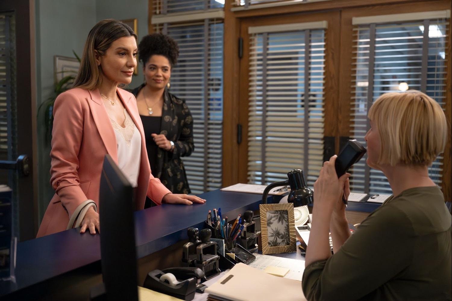 Meanwhile, at the LAPD, a camera crew arrives with Nedda Donovan (Nasim Pedrad) who is the subject of a documentary about the case, titled The Sauna at the End of the Stairs. Daphne (Javicia Leslie) and Oz (Dennis Akdeniz) work to keep Nedda from interfering. Nedda holds up a promotional poster for her documentary, claiming, “I know for a fact that George’s confession is a scam." Oz snaps a picture of the poster and steps out to update Soto, while Daphne stays behind to probe deeper.