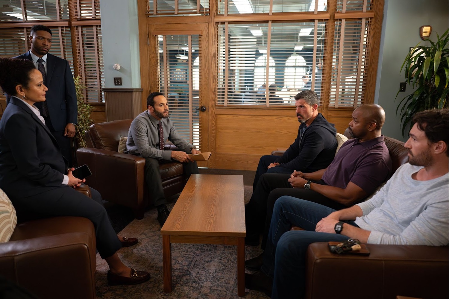 The security team is next—Terrence Cross (Andy Martinez Jr.), Hank Mueller (Joe Alvarez), and Parker Graham (Marshall Cook). They describe Anson as meticulous about security, but one part of his schedule was oddly unaccounted for: a two-hour gap in Orange County, during which they had waited outside an office building while Anson went in alone. Morgan notices Parker fidgeting with his bulky keychain, which includes a flint stone.