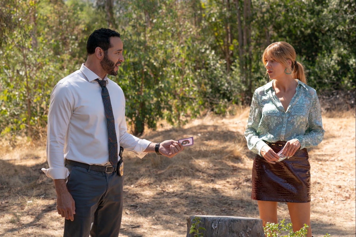 As they hike through the location, Karadec and Morgan come across a tree with pinned playing cards—Loco Ocho. Another card is tacked to a stump with instructions to play a game and follow that number’s path. The game ends in 2, and Morgan says that’s the most likely outcome of every game they could play. Karadec is skeptical but follows her lead.
