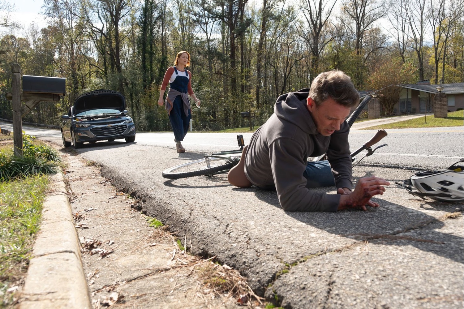 Angie was trying to perform an oil change on her car for the first time by herself. Pulled over on the side of a road, as she topped off the tank, a biker was nearly run off the road by a driver who didn’t stop. Angie rushed to help the man, Seth McDale (Scott Foley), who hurt his wrist in the fall. She offers to take him to the hospital.