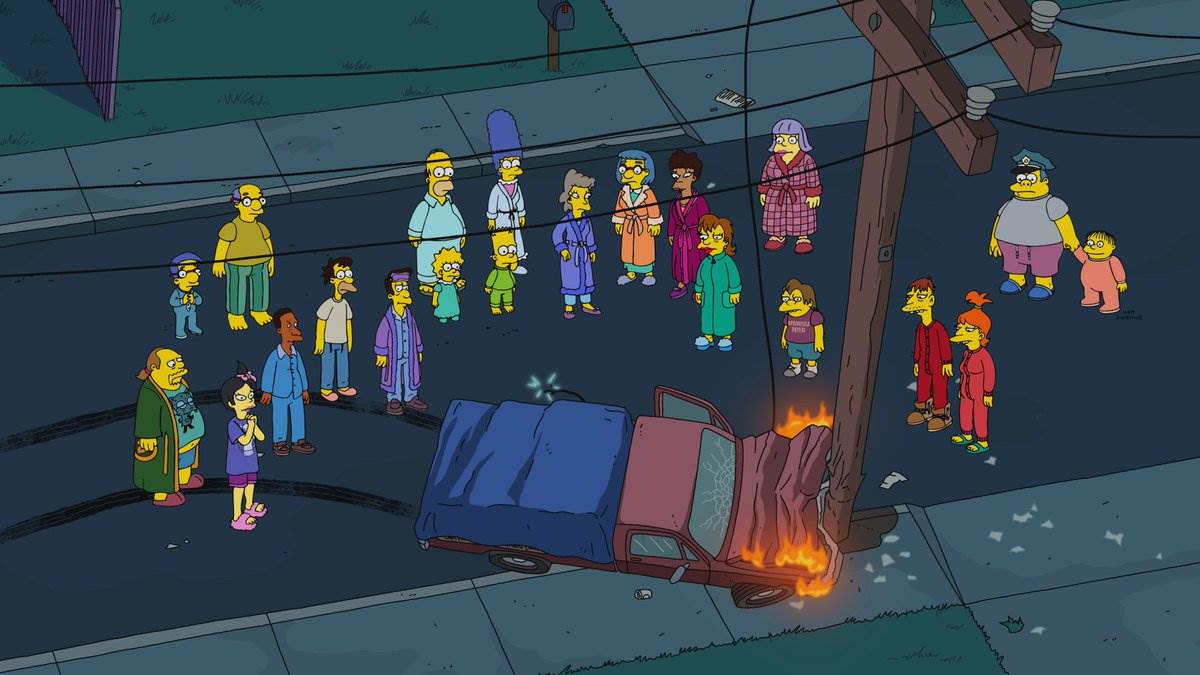 “Iron Marge" begins with Bart Simpson (voiced, as always, by Nancy Cartwright) illicitly watching John Wick 4– specifically a scene set in an assassins-only gelato parlor– in the living room after the rest of the family has gone to sleep. Suddenly there’s a car crash outside and Bart has to pretend to have just woken up as Homer (Dan Castellaneta), Marge (Julie Kavner), and Lisa (Yeardley Smith) go outside to investigate. It seems everyone in the neighborhood had the same idea, and there are even characters like the Spucklers who I didn’t think lived anywhere near the Simpsons checking out the wreck. During the impromptu gathering on Evergreen Terrace, Marge’s tattered old robe (which she cinches together with Bart’s smart-phone charging cord) becomes the subject of a judgmental discussion among the other housewives. Then this week’s B-story kicks off with Homer reporting a downed electrical wire on an app called Alarmist, via the recommendation of Comic Book Guy (Hank Azaria), earning points and beginning to climb a social-media ladder for alerting other Springfieldians to the danger.