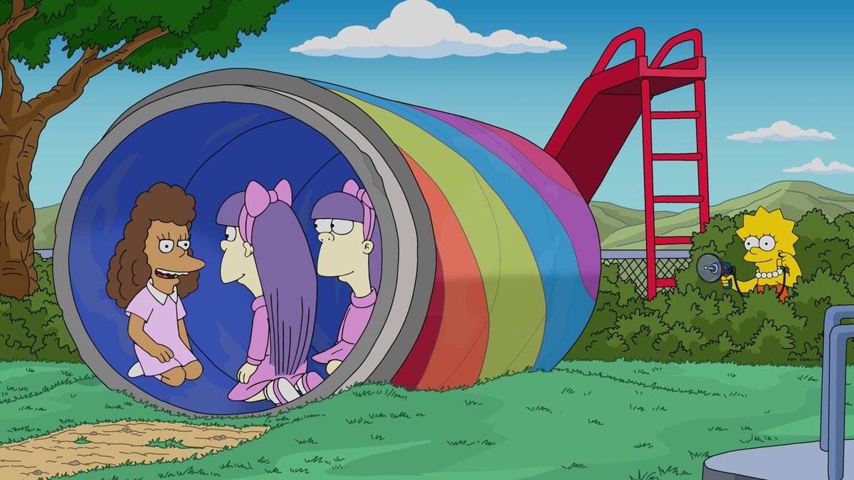 Later at Marge’s birthday dinner, Homer simply contributes to Marge’s growing charm bracelet, while the kids actually give her a whopping two ironing board covers– and it turns out she already had one to begin with. Then they go off on their merry way to make use of the spy kit, which they love, but its powers of listening in on conversations reveals that Marge isn’t happy at all with her gifts. Homer, in the meantime, goes about town reporting all sorts of minor threats to the Alarmist app (like an ever-so-slightly risque billboard) steadily growing in status on the leaderboard. He soon discovers that his chief rival for the top position is Agnes Skinner (Tress MacNeille), and the two begin a feud that sees them competing over who can report more hazards in Springfield Park. Lisa and Bart use their spy kit’s lockpick to break into Marge’s private memory chest to discover more about their mother in the hopes of getting her a more personal gift, and through old photos they stumble upon the fact that she had a parrot named Petey when she was a young girl, and that her parents gave Petey away. Lisa theorizes that Petey may still be alive, so the two siblings take a several-hour bus trip to track the parrot down. Once they do, through a series of events that forces two members of the same family to miss a wedding, they’re able to lure Petey into the spy kit’s box using a recording of Marge’s voice.