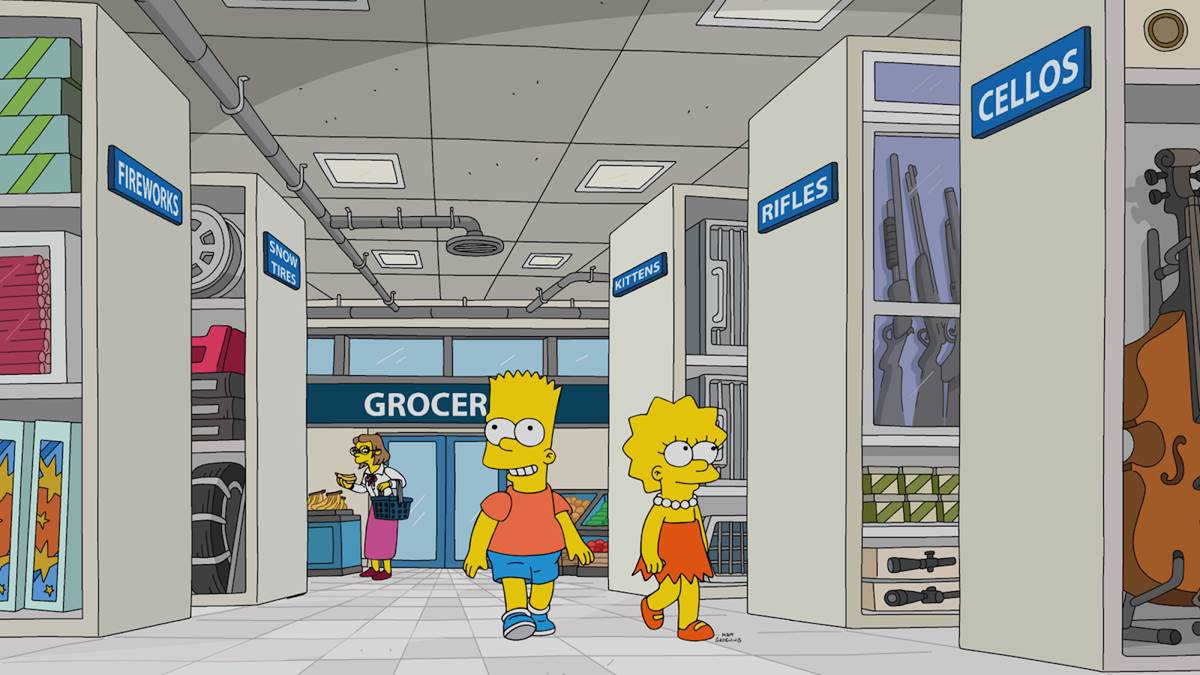 Feeling guilty about never having bought their mother a new robe, Bart and Lisa talk Ned Flanders (Harry Shearer) into giving them $44 dollars for picking up a couple leaves, then go to the local big-box store Bullseye (their logo looks like a target) to shop for Marge’s birthday. But as they’re walking to the register with a nice new robe, a kids’ toy spy kit catches their eyes. Bart decides to buy that instead, and they opt to give Marge the complimentary Bullseye ironing board cover that comes with the application for a credit card. This scene had what I thought was the absolute funniest moment of the episode, with Lisa stuffing the now-abandoned robe into a refrigerator full of soda bottles. That moment was expressed entirely through animation, but was so well-executed it sticks out in my memory as having elicited the biggest laugh.