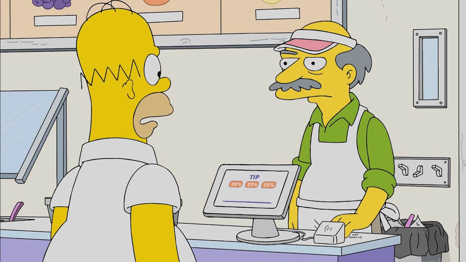 At Moe’s Tavern, Moe (also Hank Azaria) enables Homer, encouraging him to take money out of his wallet and just hold it there. “Everything but the tip," Moe calls it. But, of course, as bills come out of Homer’s wallet, they wander into Moe’s waiting hand. “Oh God," Moe climaxes as Homer fills up his hand with bills. Further down the bar, Barney, Lenny, and Carl watch in horror. Homer runs out of the bar and Moe chases after him. “No one service worker can satisfy my needs," Homer complains as he ventures into the night to find more people to tip. Everywhere is closed, and Homer ends up breaking into a pharmacy to put a bill in an empty tip jar. When he returns home, he sees Marge through the window, crying over a pile of bills. “They’re 20%... no, 22% better off without me," he says as he runs away.