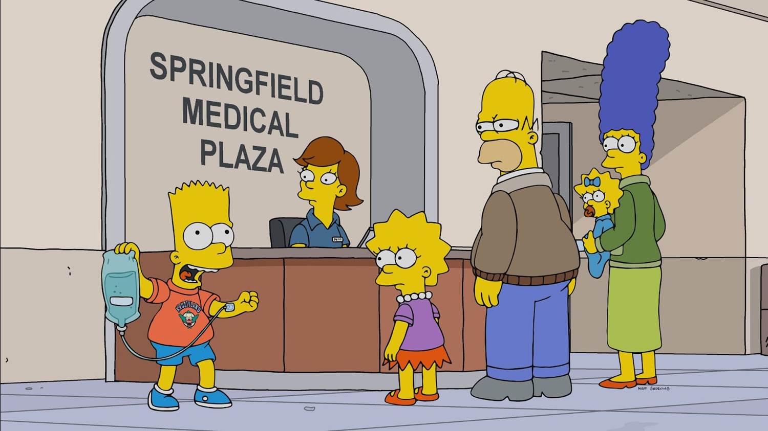 Marge reveals that they just hit their deductible thanks to Homer’s kidney stones and that their insurance plan starts over tomorrow, so they’re cramming a year’s worth of medical services into one day. Following a montage of medical gags, Lisa asks Homer to take them out for treats.