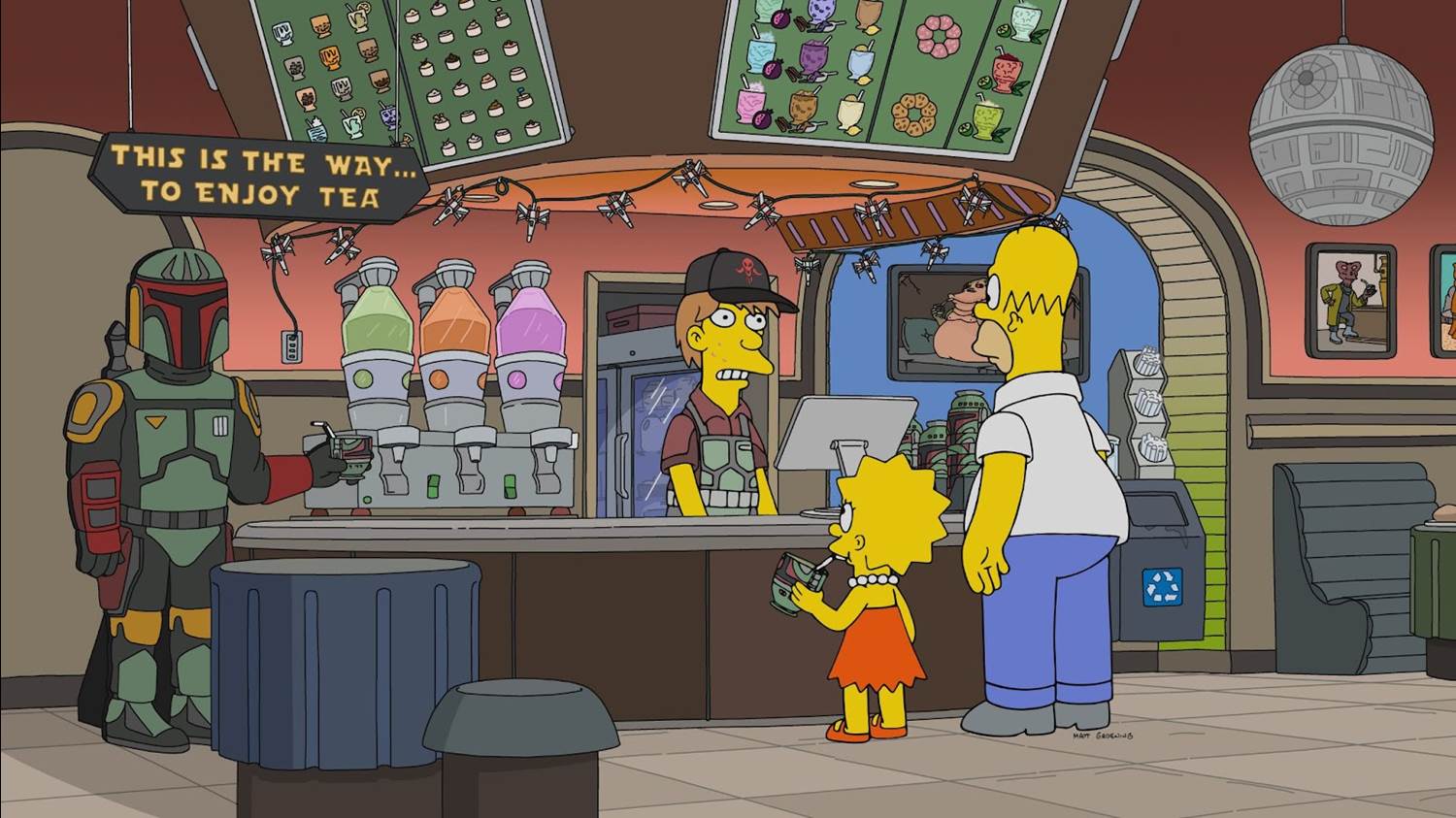 The first stop is the Boba Fette Tea Shop, where Jeremy Freedman (also Dan Castellaneta) serves Lisa, and Homer is asked for a tip when he pays. At the frozen yogurt shop, Raphael (Hank Azaria) also expects a tip. Once everyone else has been treated, Homer says it’s his turn, taking the family to the Springfield Pub & Brewery (formerly the Springfield Public Library with some minor changes to the signage out front). When the bill comes, Homer is angry about having to do the math to figure out the tip. But then the waitress, Sandee (Tress MacNeille), points out that there’s an automatic service fee included. Homer is both angry and relieved by its presence, particularly that he doesn’t need to tip now. Sandee points out that he can still tip on the line at the bottom below where she pre-thanked him. Homer is furious. “No, thank you," he grunts as he writes, “Here’s $1.00, OK?"