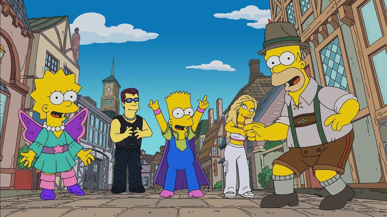 Bart and Lisa ride their bikes to Little Europe, finding Homer on his way to five shops to buy ingredients for one sandwich. As Homer buys mustard, we see the screen presents him with several tip options, but all of the buttons are for $0. Homer begins to perform an autotuned Eurovision-style song with assistance from some of Little Europe’s service workers, including DJ Crazy Times (Kyle Gordon) and Ms. Biljana Electronica (Chrissi Poland). Bart and Lisa also get in on the act.