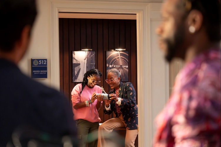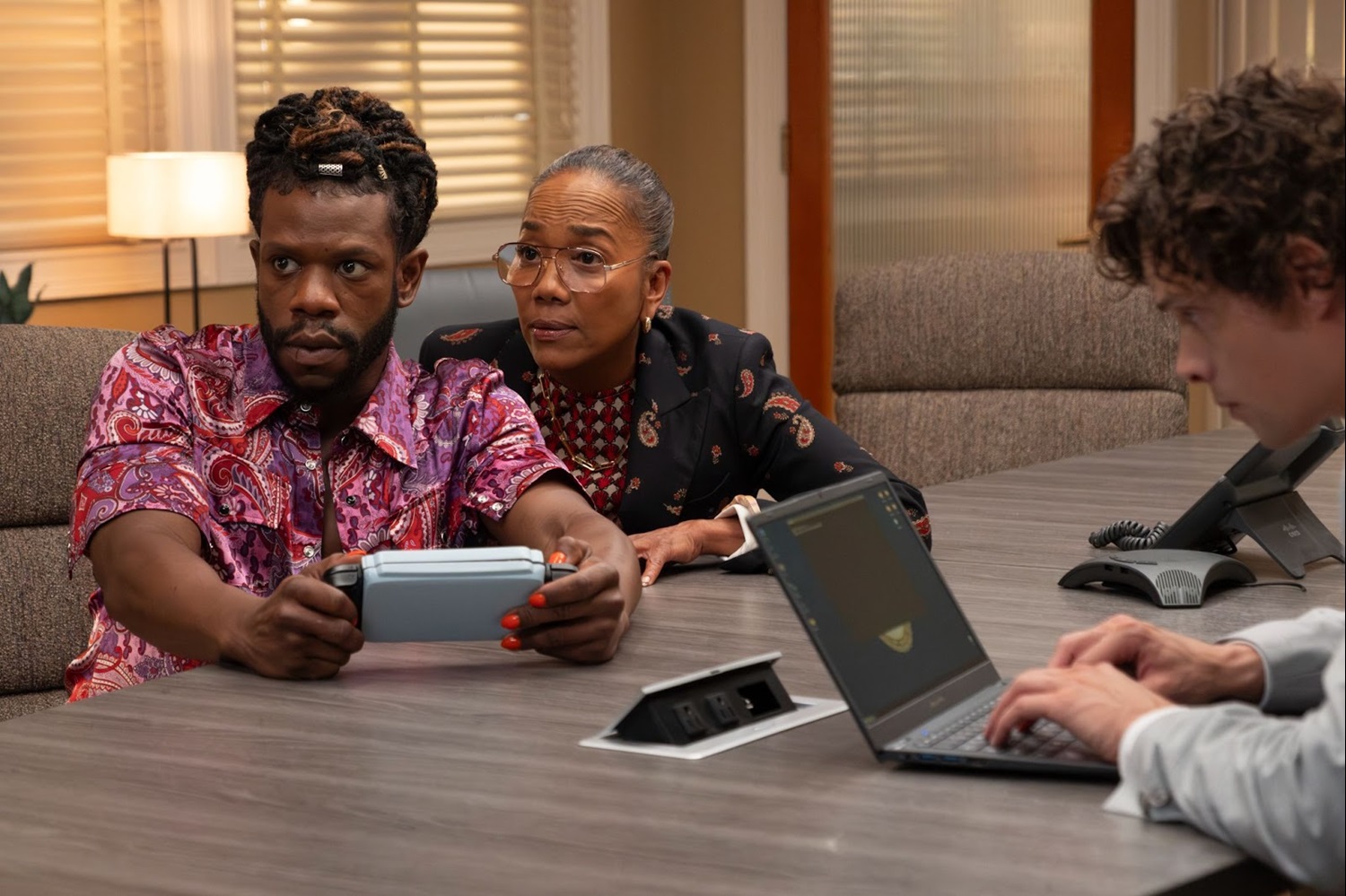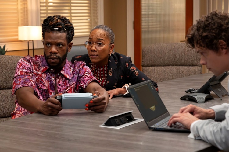 In the security guard shack at Waldorf Estates, Angie Polaski (Erika Christensen) works on an apology speech with the help of AI, but she is distracted by a man named John (Dan Gill) who is loudly hammering in a new security monitor on the roof. He ends up falling, and later, he stops by with flowers for Angie in exchange for her not filing a report about his fall so he can keep his job.