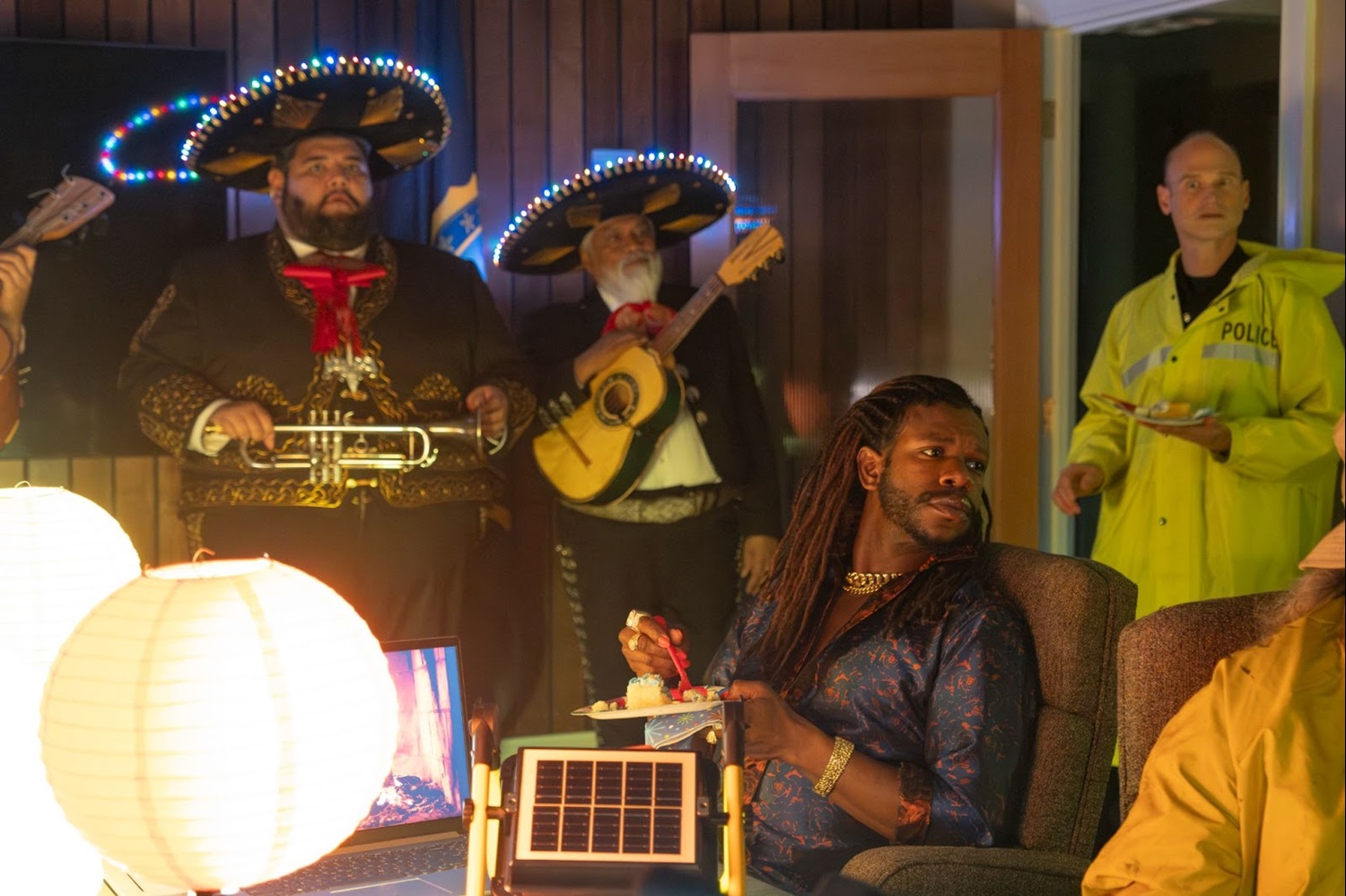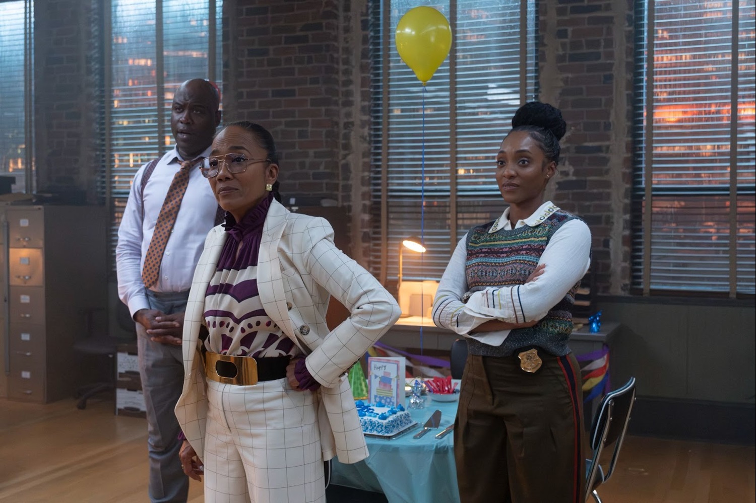 Down at the APD, Faith Mitchell (Iantha Richardson), Michael Ormewood (Jake McLaughlin), and Franklin (Kevin Daniels) have tried to decorate for Caroline’s surprise party, but Amanda is sad to see how unfestive it looks. Not even Ormewood’s mannequin, complete with night vision goggles, makes the place look good. Thankfully, Captain Heller (Todd Allen Durkin) helps a mariachi band find the party spot. Just then, a lightning strike causes the power to go out. The mariachi band clap, revealing that their hats light up. The men head off to find the emergency generator.