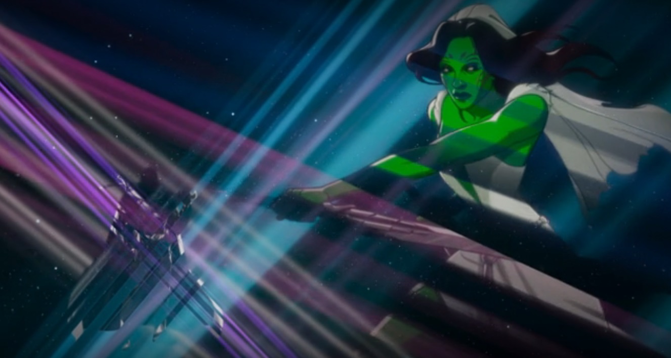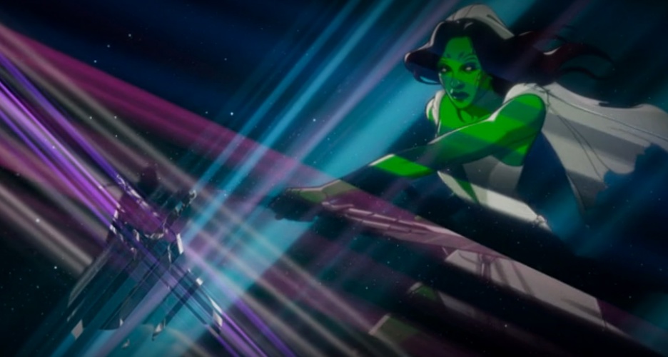 We get another character mash-up that has more of a background in the comics with this look at an older Hulk wielding both Doctor Strange’s Cloak of Levitation and using magical powers. In the comics, as first seen in the limited series Future Imperfect, an older version of Bruce Banner/Hulk became the fearsome Maestro, a warlord who had collected trophies from all of the dead superheroes, including Strange’s Cloak. This What If…? Hulk is clearly visually modeled after the Maestro, sporting his distinctive long white hair and beard, but he actually appears to have acquired magical abilities, something the Maestro did not.
