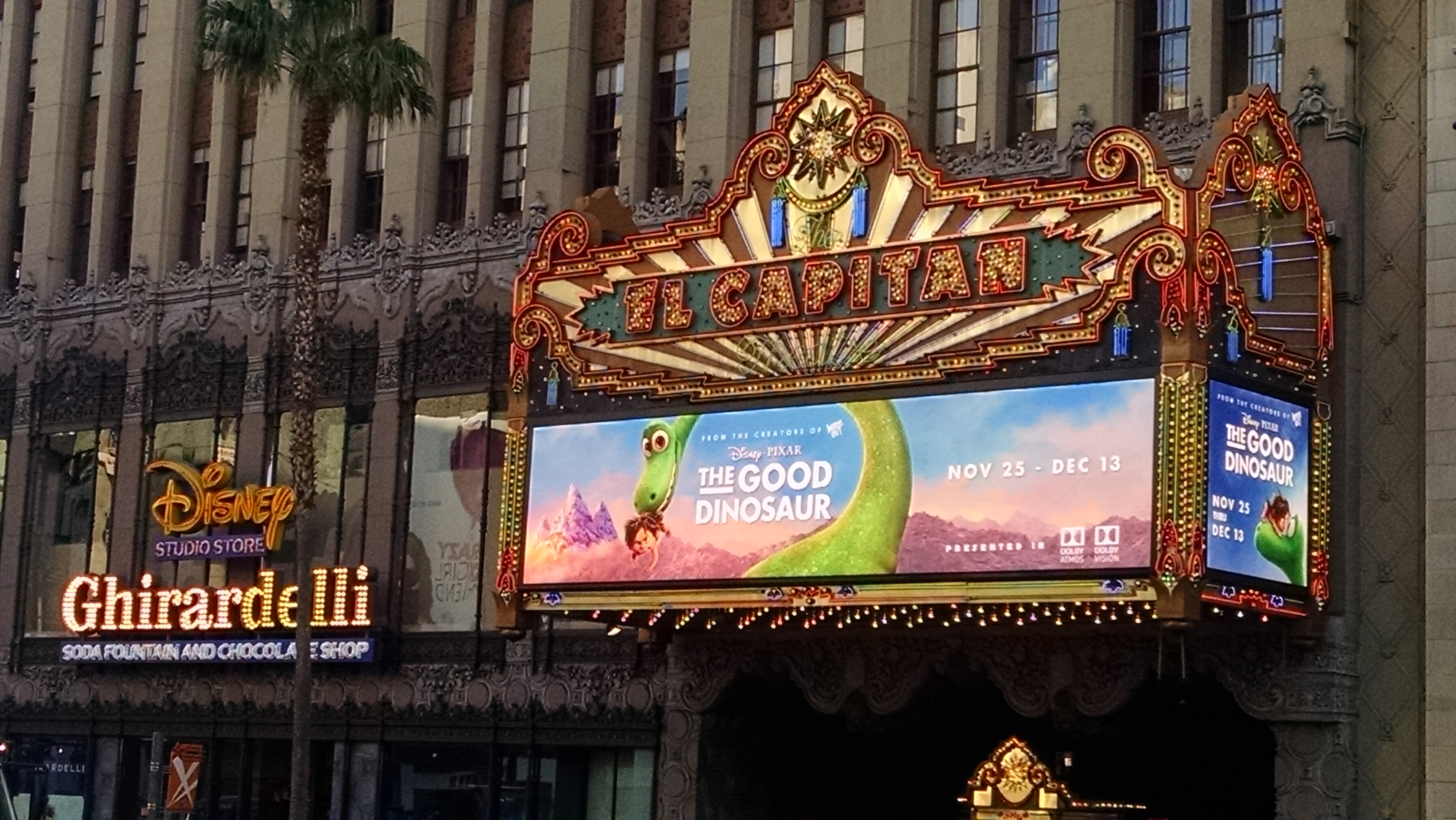 If you’re like me and have to see the latest Pixar film in theaters or if you have kids and want to take them to a family movie before the PG-13 Star Wars: The Force Awakens dominates the holiday season, then I highly recommend making the trip out to Hollywood to the El Capitan from Nov. 25th - Dec. 13th to celebrate 20 years of Pixar movies by seeing The Good Dinosaur.