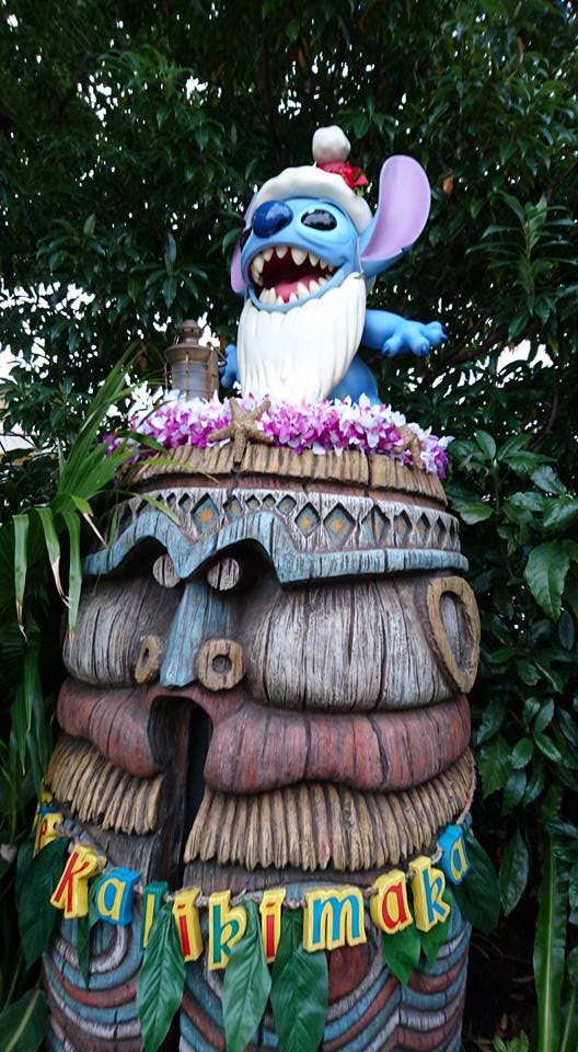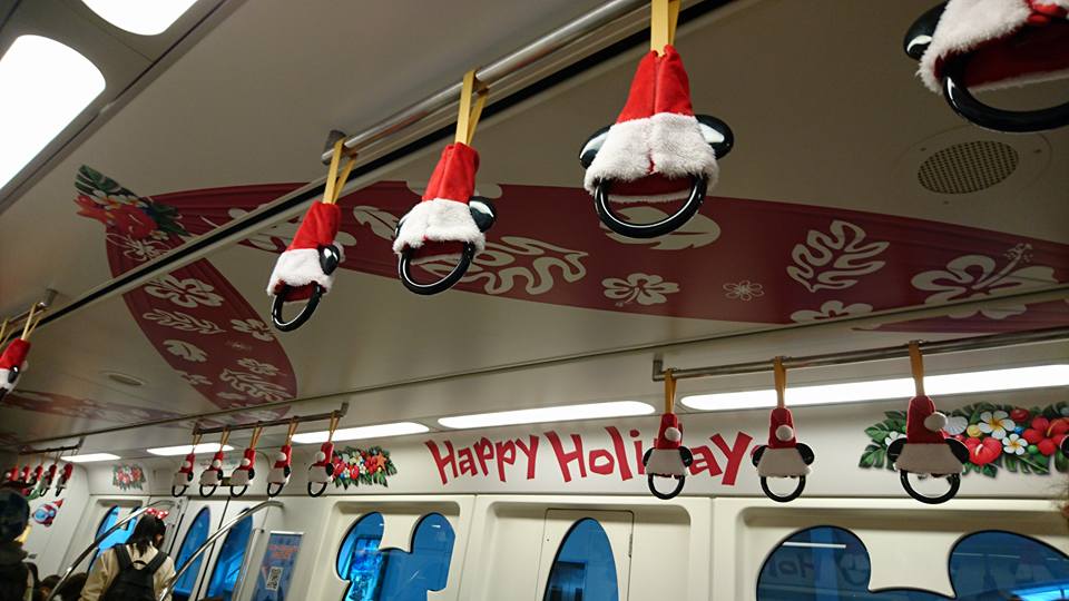 The Tokyo Disney Resort Line (Monorail) is also celebrating the holidays. All the stations have been decorated with banners, wreaths and tinsel. And even one of the monorails has received a Christmas transformation with a Hawaiian theme to help promote the new Stitch Encounter attraction.