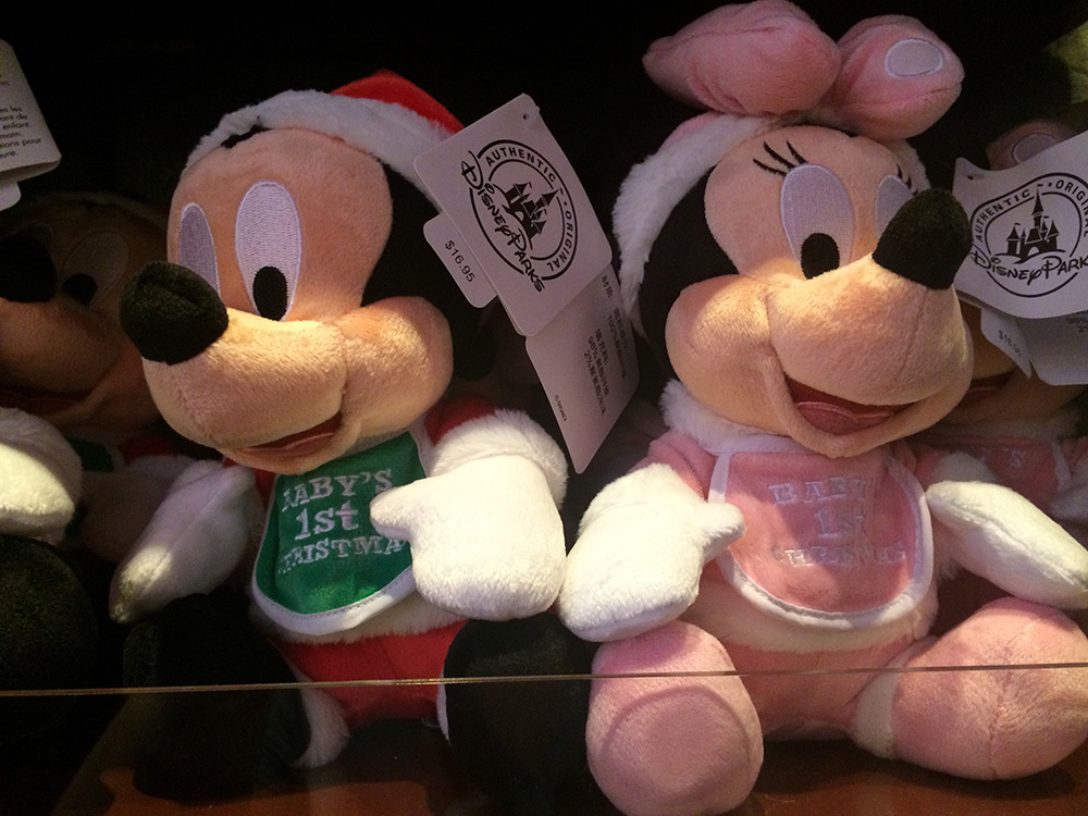 This pair of plushes is available in both large and small sizes. Mickey and Minnie each hold a plush ornament that is themed to their traditional outfit (Minnie’s has polka dots, for instance).