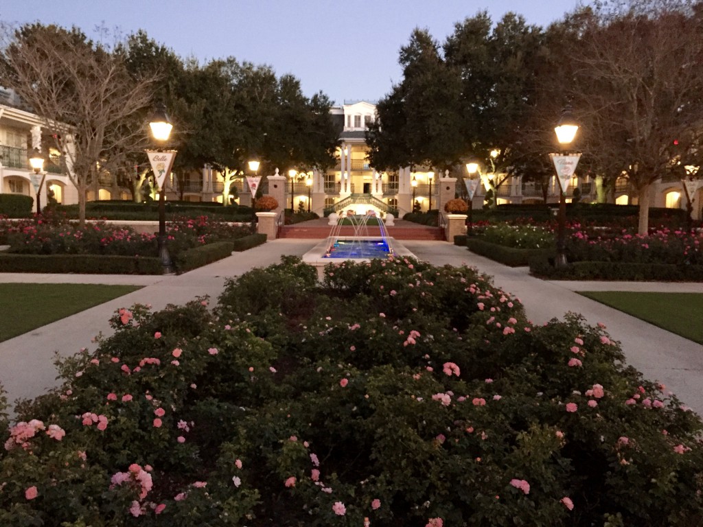 With The Princess and the Frog being set in New Orleans, the beautiful mansion buildings of Port Orleans were the perfect choice to add the Royal themeing to. Starting on the grounds outside the buildings, between the flower color choices and banners, you are teased with what is in store for you once to you get to your room.