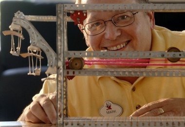 It was shortly before Thanksgiving holiday in 1996 and we said let’s go on holiday and when we come back we’ll tackle this problem. Most Imagineers, they don’t leave their work in the office, and I got to thinking a little bit about it. I sketched up a mechanism and thought this might work but it’s going to be really difficult to explain how this works on paper. So I got out my 50s era erector set, and I built a working model where you can turn a little crank and three little seats go up in the air and I brought that in a grocery sack to the next meeting and everybody said we’ve got to tackle this problem and I said how about doing something like this and I put it on the table and cranked it up and everybody said, gee can you do that full size? I said, I don’t know, give me a little time and I’ll do some engineering on it and that sort of kicked it off. The mechanism that’s out there is exactly like the model I built. We get from the high tech, the latest virtual reality technology, to the low tech which is 1950s kid’s toy.
