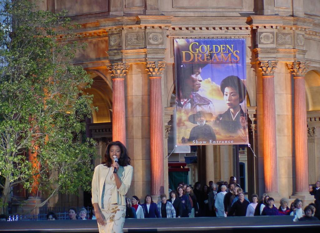 Iger: As I mentioned earlier, Golden Dreams celebrates the dreamers and the dreams of California. But there is one dream we all have in common, just one dream for a better life. In fact, that is the title of the theme song for Golden Dreams, which was conceived by Grammy award winning producer Walter Afanasieff and lyricist John Bettis. Ladies and Gentlemen, Just One Dream.The voices backing up Goldberry (106 in all) were from the following churches: