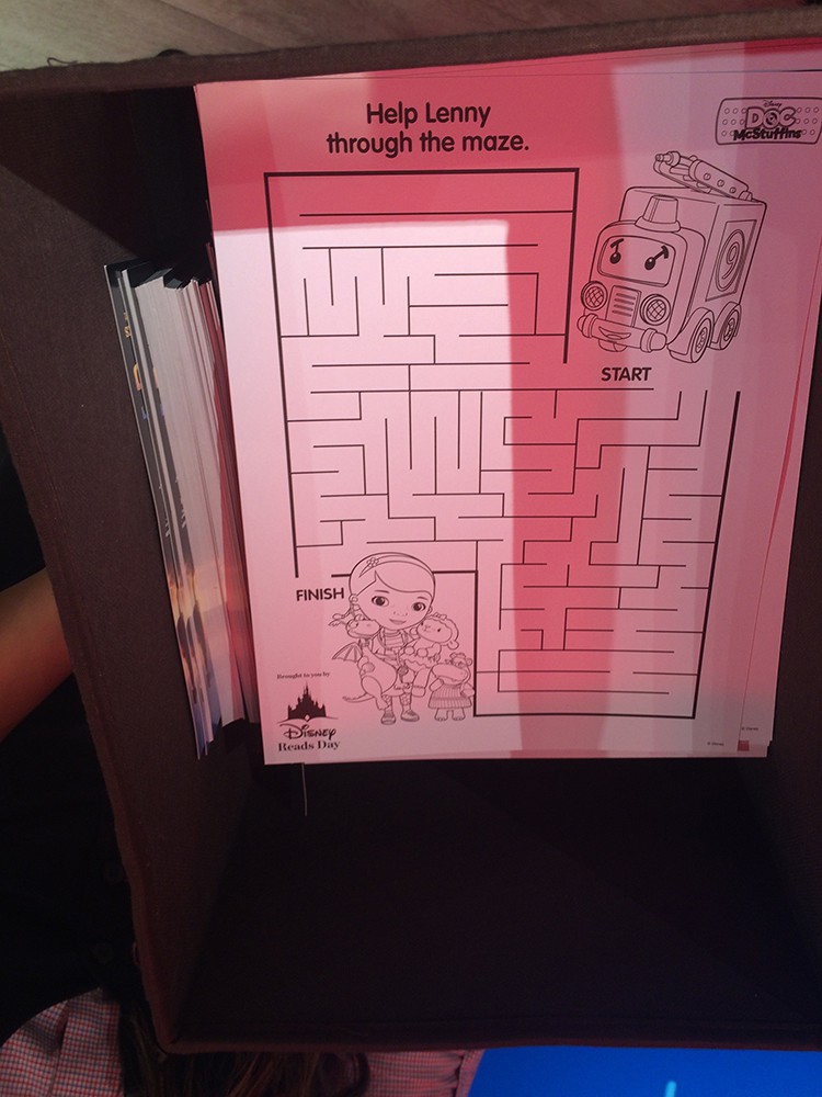 After every story, Cast Members came out with a box of goodies for the children in the audience. They passed out bookmarks promoting the upcoming film, The BFG, as well as an activity sheet. An extra-special feature of the activity page was that on the back was information for the parents about Disney Story Central, a website and iDevice app containing a library of kid-friendly stories starring beloved Disney characters. Along with information, a code was included that unlocked unlimited access on Disney Reads Day.
