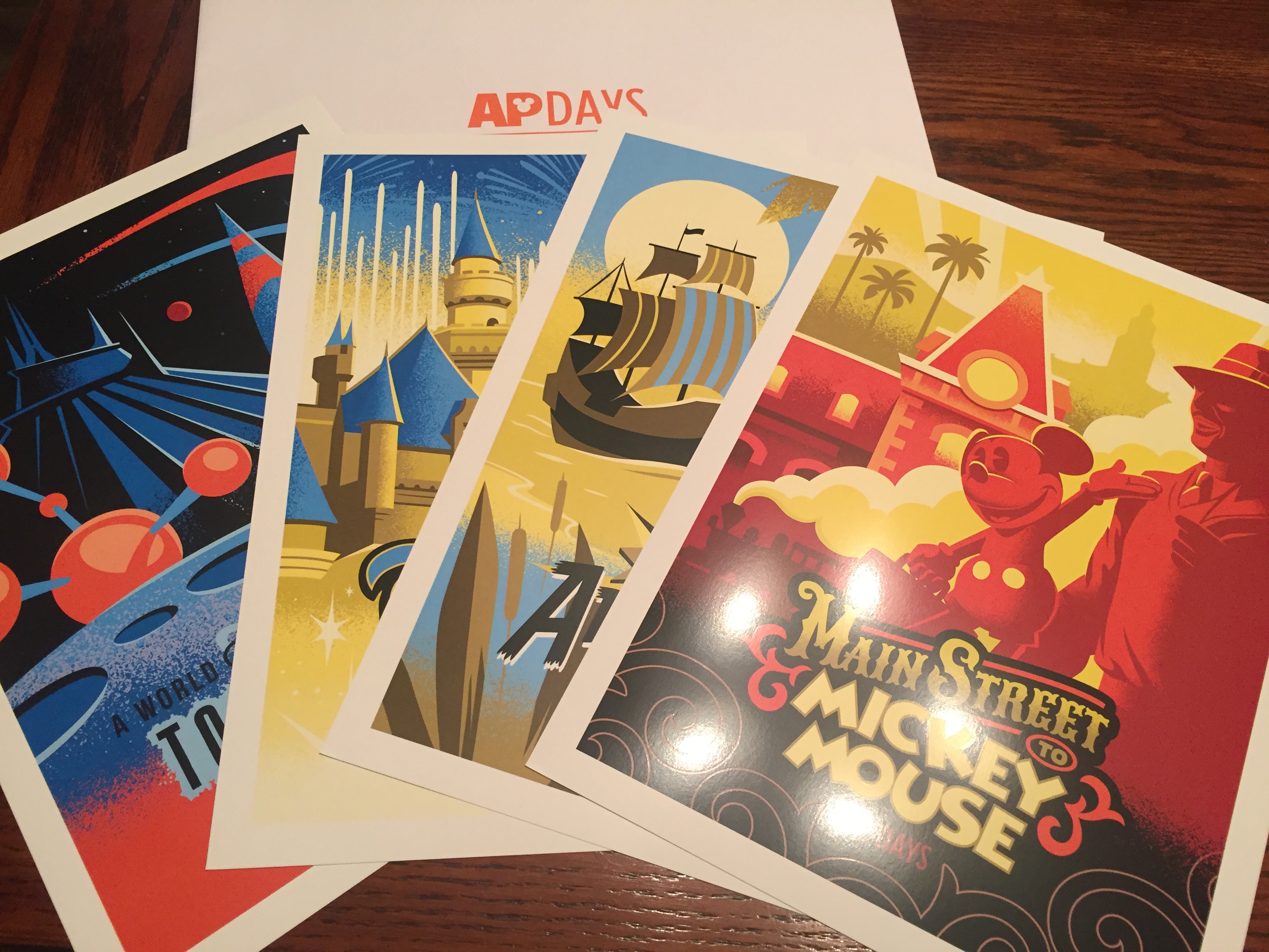 As we exited the Dream Suite, our tour was over. However, there were a few parting gifts which were distributed during lunch. One is a hinged pin on a card commemorating the tour which features Walt's dedication plaque. The other gift was exclusive to the AP version of the tour, four lithographs representing the artwork on the four buttons that were available weekly to Passholders for AP Days.