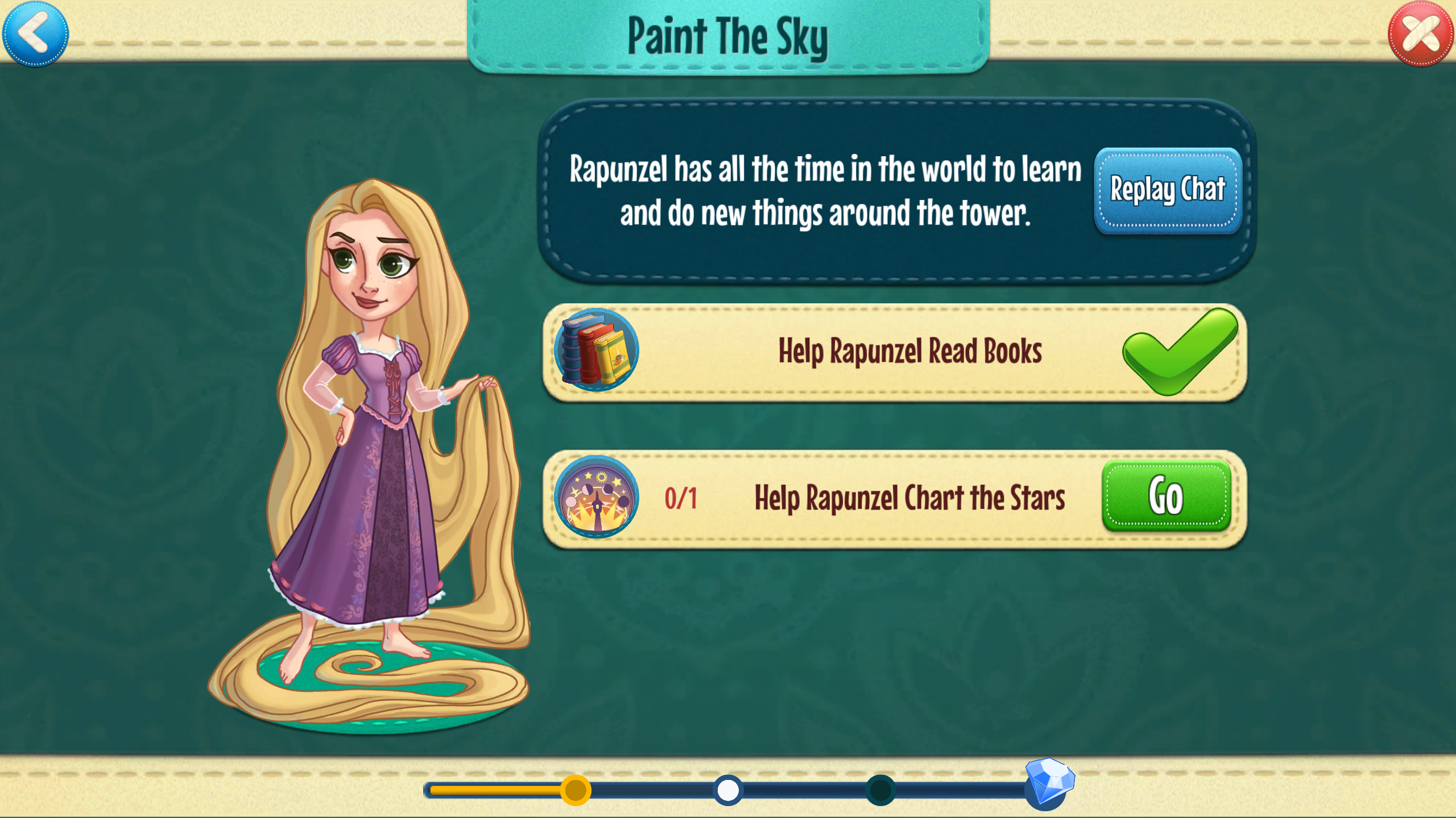 If you are looking for an app that your kids will just adore, this is the one for you. I really like that, when I play this with my daughter, she knows the major plot points that you will come across from watching the movies. We chose to start with Tangled, which was not a disappointment. Each story starts with a brief review of the beginning of the story and then lets you take over. With the help of your Fairy Godmother, you learn how to earn new characters, complete tasks, and even earn new story moments. Finish all the tasks to create new spaces on your story blanket to make your living kingdom bigger and better!