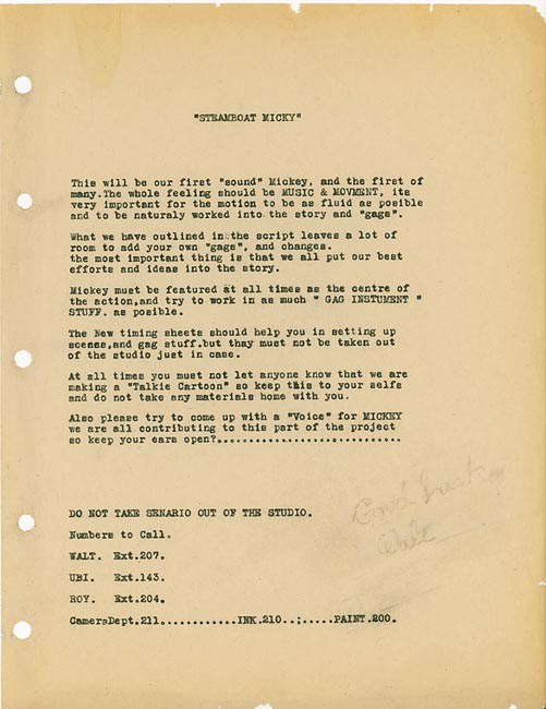 While asking everyone to contribute to the project, Walt's memo also instructs his staff to keep their “ears open” for a voice for his new creation. “Also please try to come up with a “Voice” for MICKEY,” Walt asks in his script note. The memo portion of the draft includes studio phone extensions for Walt, his brother Roy, Ub Iwerks and the camera, ink and paint departments.