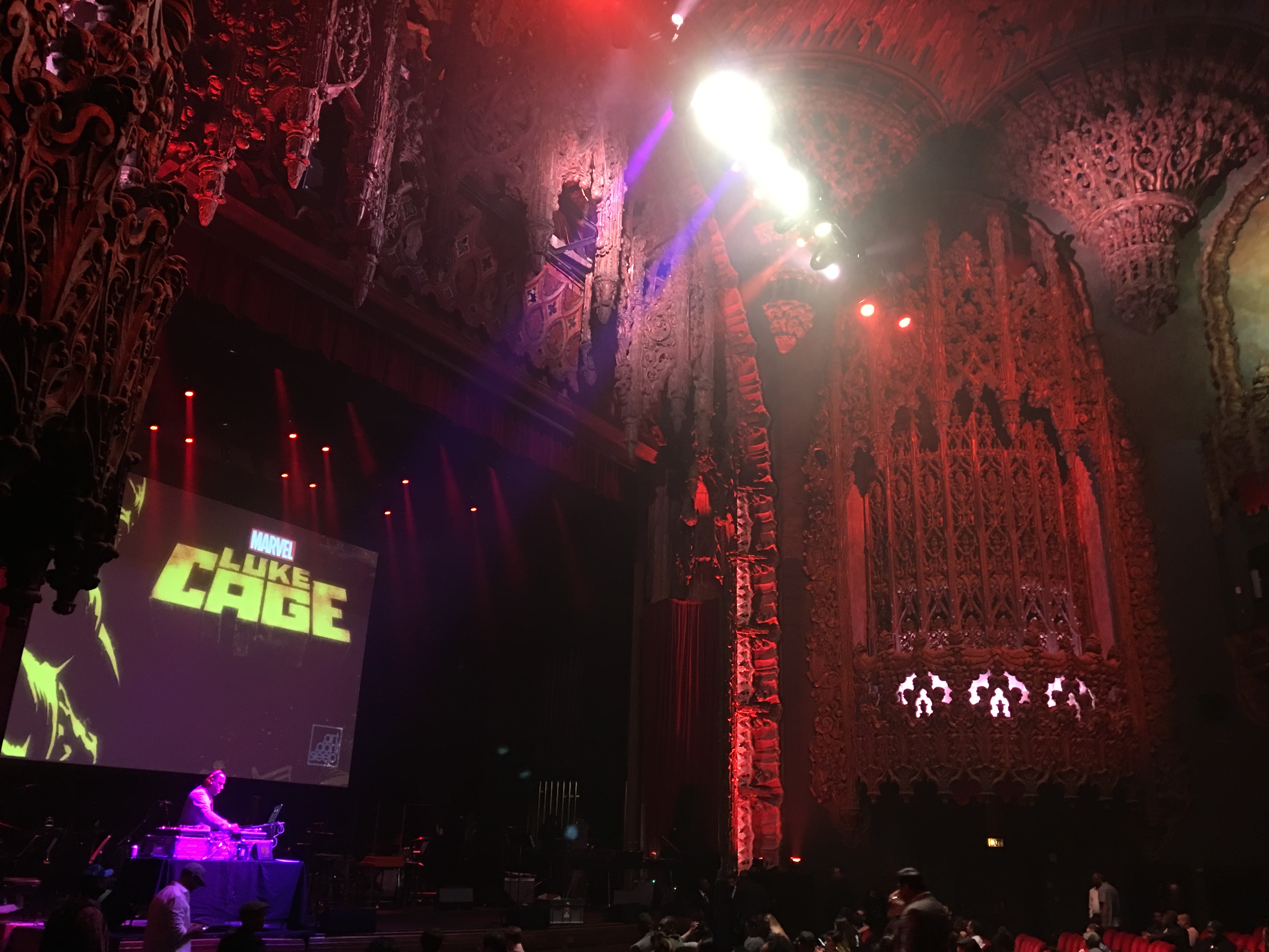 The lights are not down in The Theatre at The Ace Hotel in Hollywood when comedian Russell Peters takes the stage, and more than half the audience is not in their seats. Rather they are still out in the lobby, getting drinks and socializing. It is clear already that this is to be no ordinary concert. But, then again, the music to Luke Cage isn’t ordinary either. While most superhero films and TV shows rely on epic sweeping scores, the score to Luke Cage is rooted in hip-hop, jazz, and Ennio Moricone. Music is one of the defining features of Luke Cage, a black superhero living in Harlem, because the history of Harlem is one that is forever bound to music.