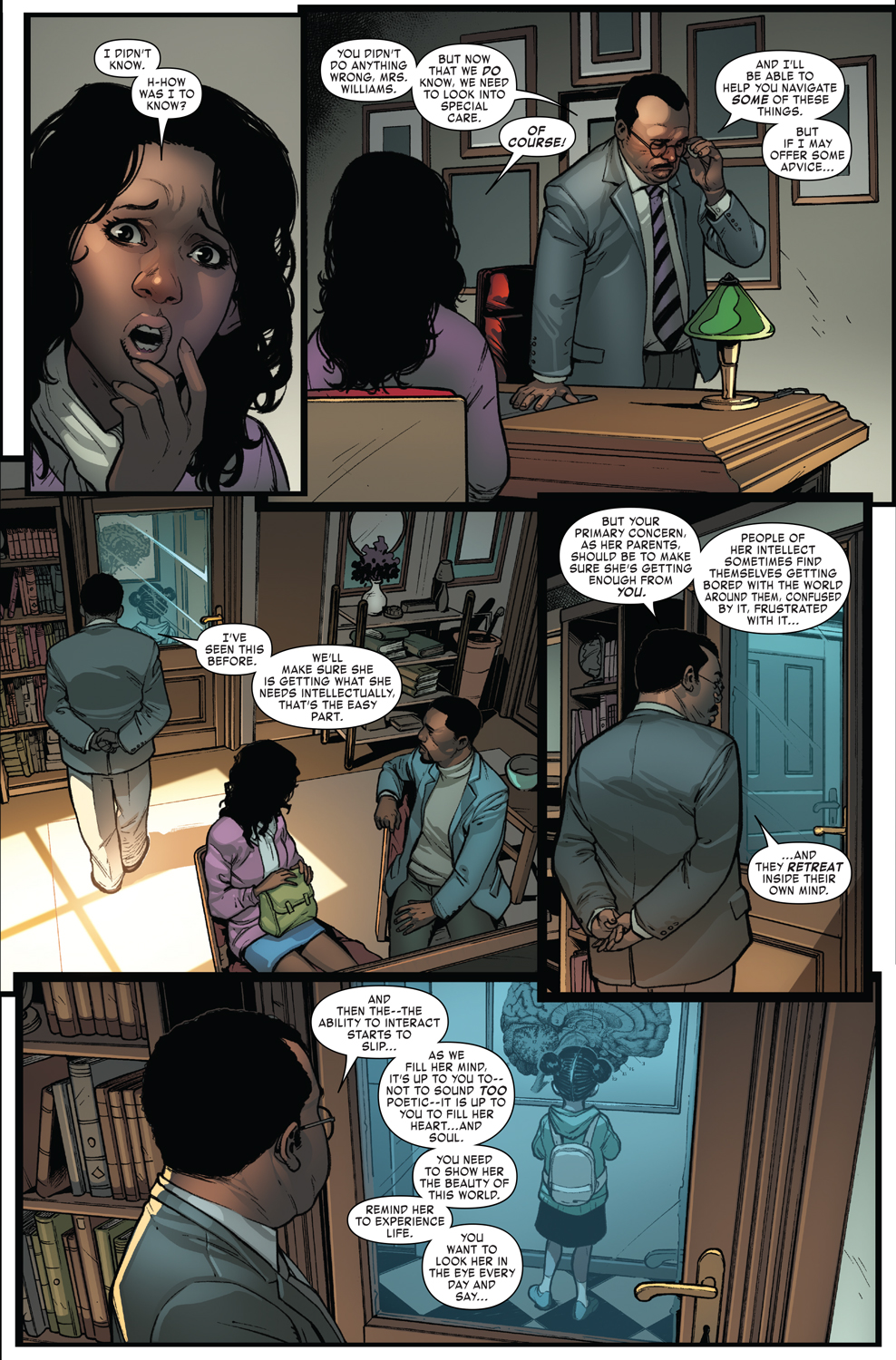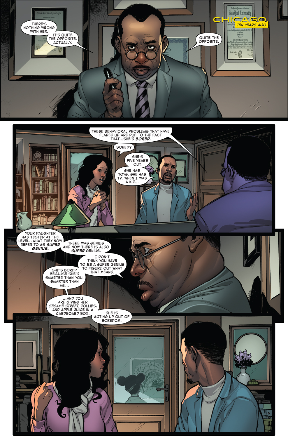 For those readers that are about to start on a new version of Iron Man with Invincible Iron Man #1, brace yourself, we have an origin story in this book. Starting in Chicago ten years prior to the current setting of the story, we meet young Riri Williams. As the standard superhero origin story goes, we learn from a doctor figure that Riri is a super genius. Riri becomes bored easily and needs to be reassured constantly. Riri’s mom and step-dad are told to remind Riri that every day is a nice day.
