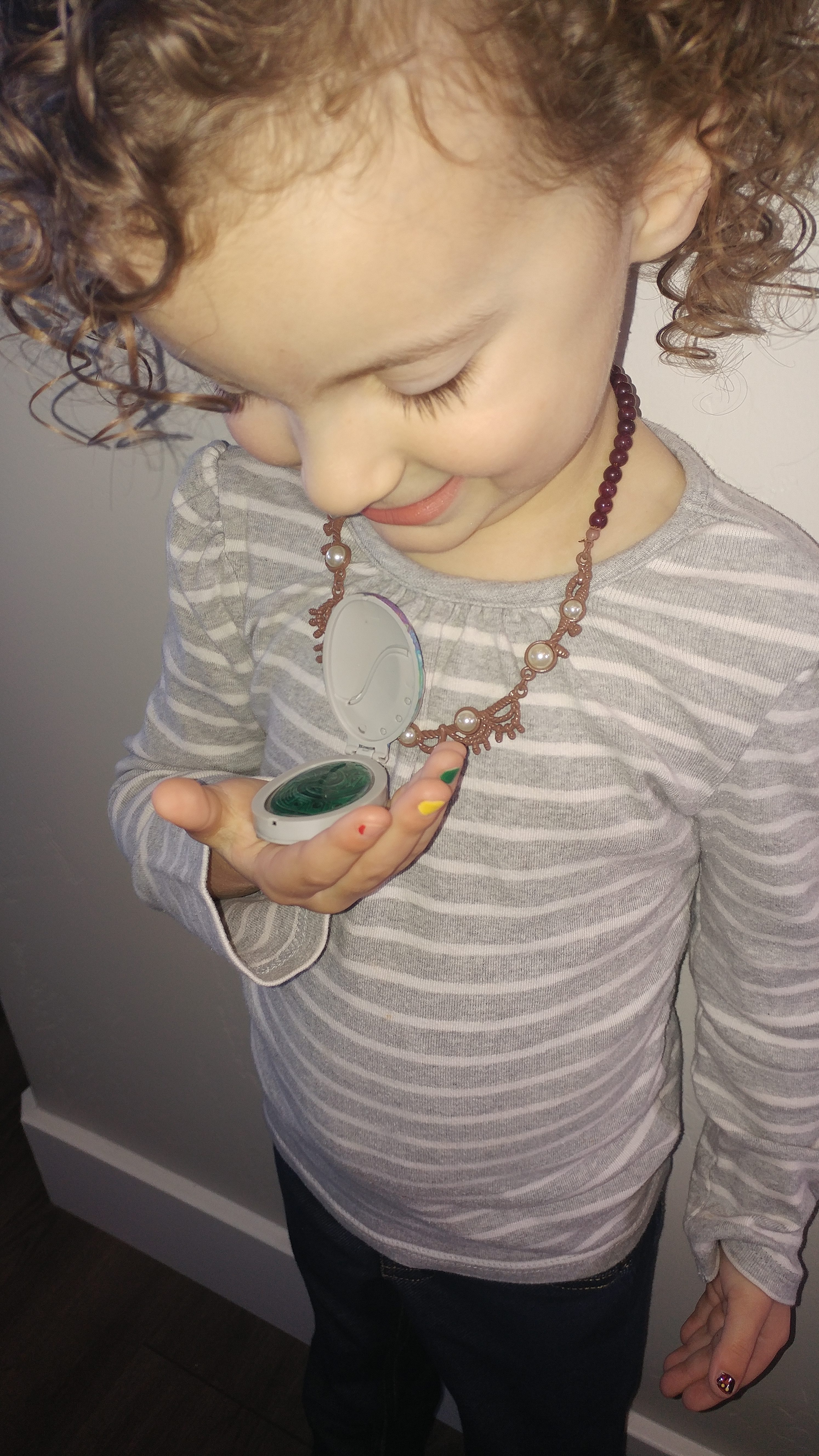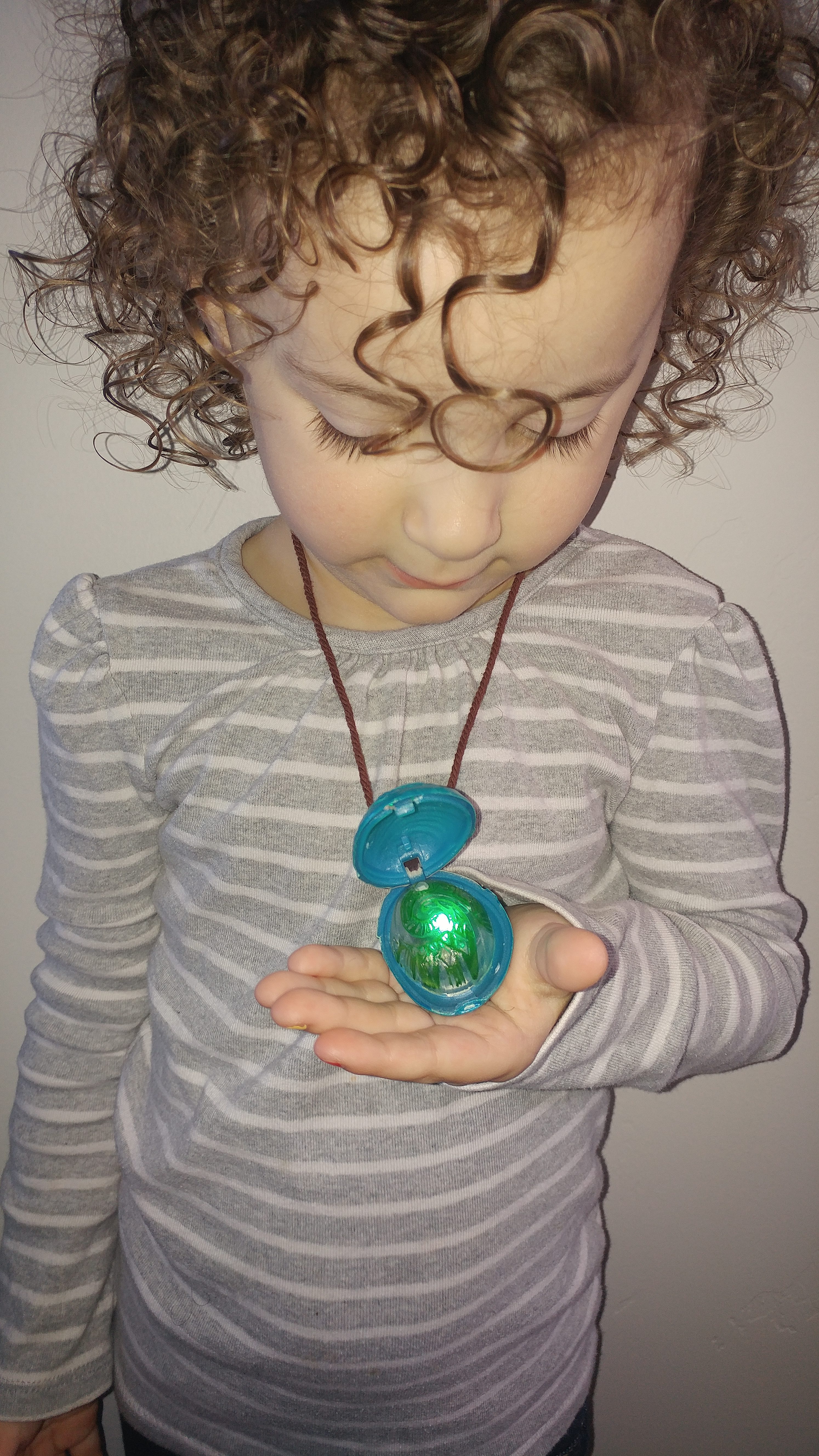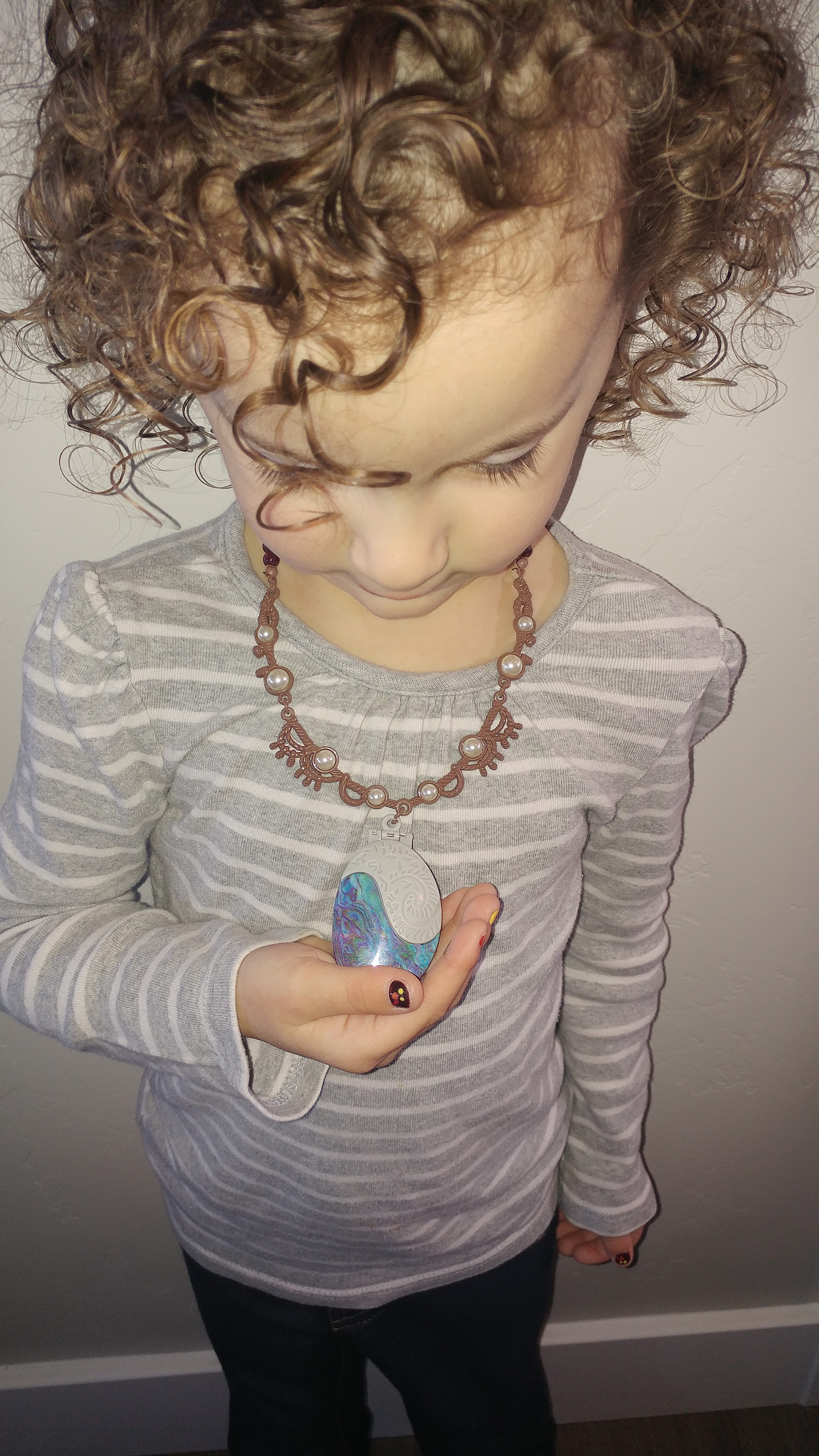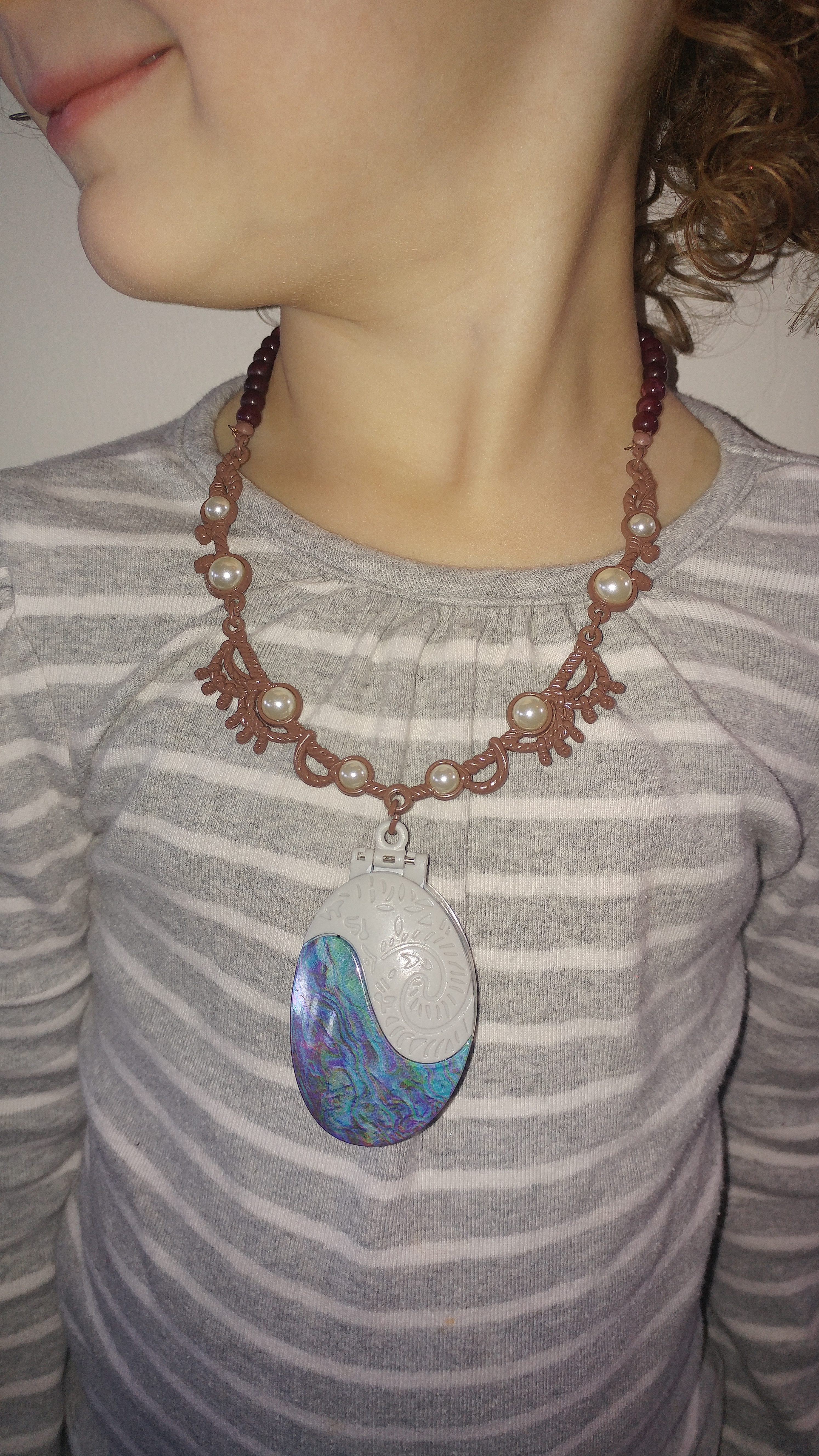 This beautiful shell necklace will make imaginary role play as Moana so much fun! This beaded necklace has fine detail with metal beading that holds together nicely with a clasp in the back. The shell compartment is hard to open at first, but once you open it and press the stone inside, you'll hear Moana sing a part of her song "How Far I'll Go". This will be sure to be a new favorite accessory to your child's collection.