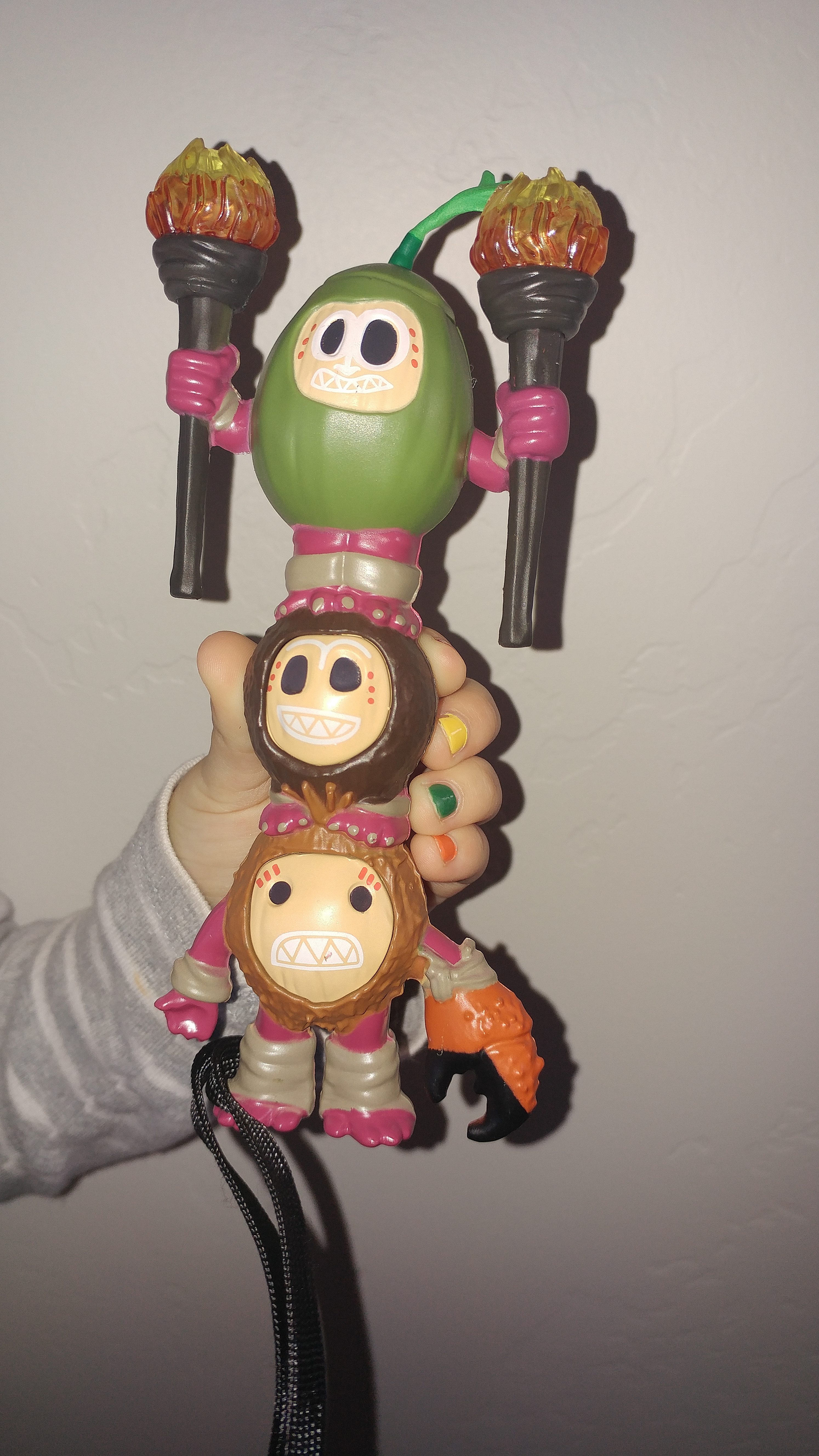 The mythical Kakamora stand on top of one another to create a cute flashlight that has two separate modes that you can control with pressing the button on the middle Kakamora's belly. One that flashes the torches on the top, and one that beams solid. Accompanied by a tiki drum sound effect, and can be shut off by pressing the button until turns off, this is a surprisingly bright little flashlight! Great for a child's room and has a tie for the wrist when needed to keep close.