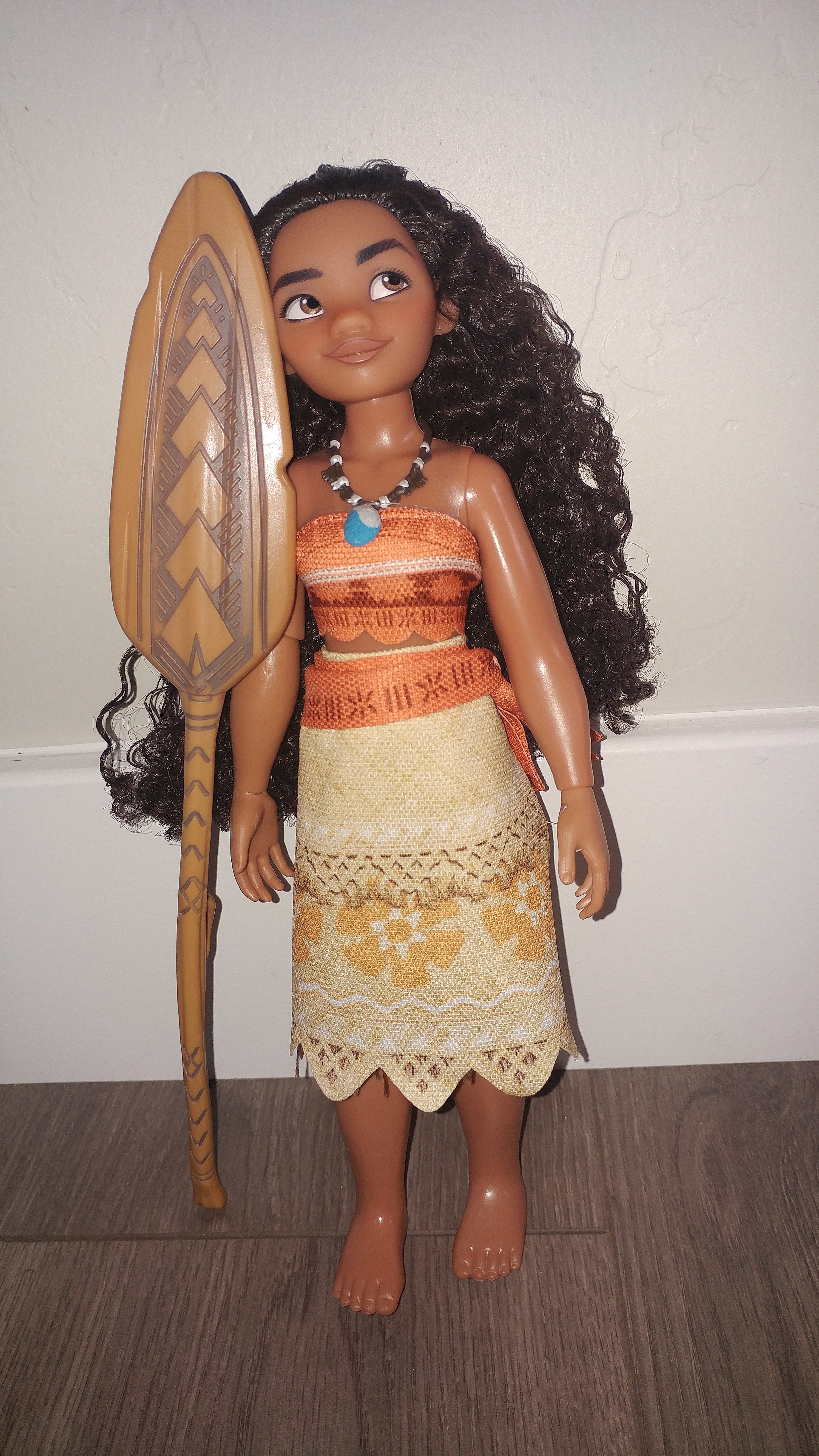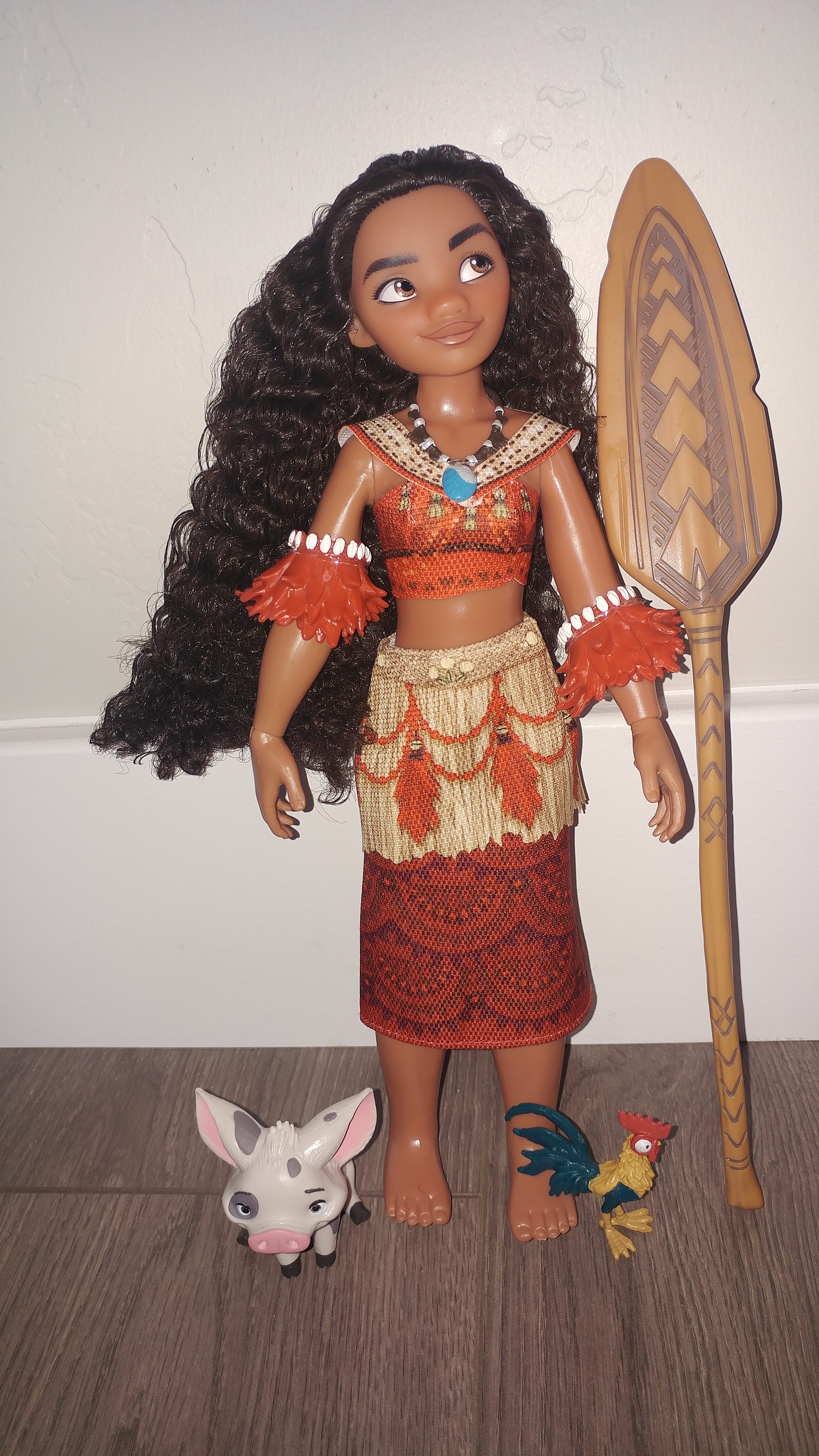 Explore the seas and find your way with Moana! This Tbeautiful doll will sure to be a new favorite for your child. From her sweet smile, to her beautiful hair, it's just what you would hope for in a Moana doll. She comes with accessories such as a head dress, arm bands, her paddle, her friends Hei Hei and Pua, and more. She has cute features and with the press of the button on her hand, she sings "How Far I'll Go". Also included is a magic light up necklace for your little one to make them feel like they are just like her! Moana will be a great addition to the growing Disney Princess family and this doll will be sure to capture your heart.