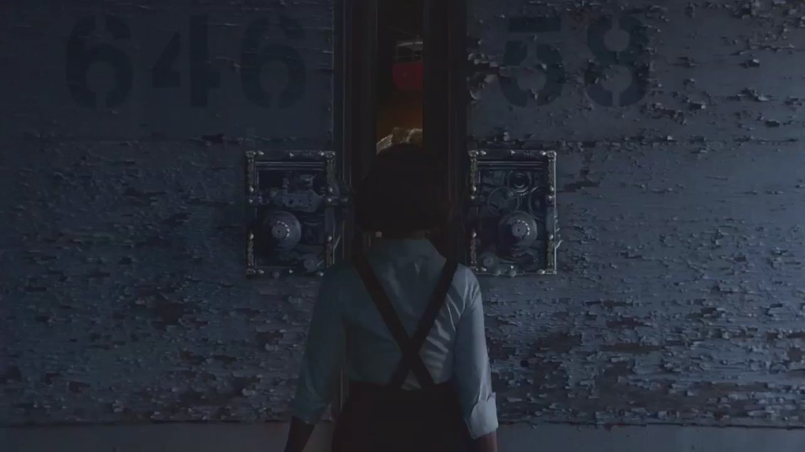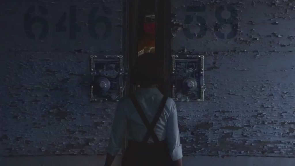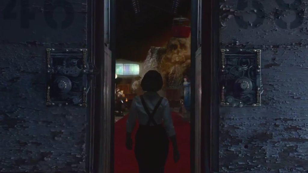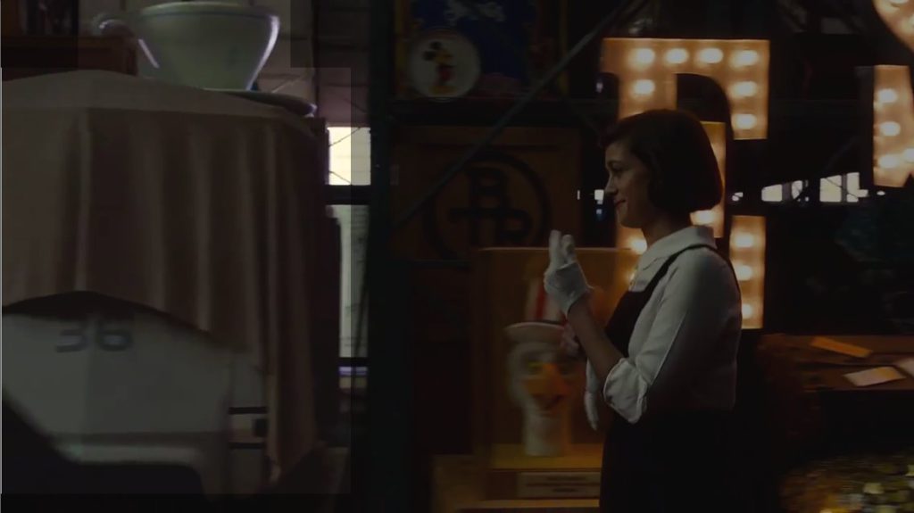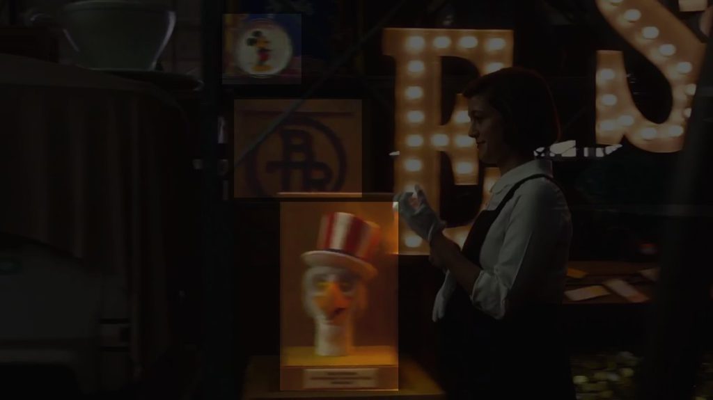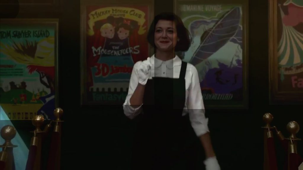 Just after four seconds the point of view shifts to the floor level. As the cast member strides down the carpet, we see a pair of doors or panels to her left (more on those below), and on the far right of the screen an old-fashioned coin-operated binocular.