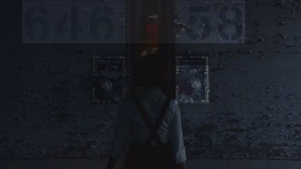 The first thing we see is an unidentified cast member, opening a warehouse door with a complicated lock and a five digit identifying number. (These are highlighted in the second image.) The five digit number, 64658, is the zip code for Marceline, Missouri, the small town where the Disney family moved when Walt was five years old, and where he later claimed to have spent the happiest years of his life. In the complicated lock to the right of the door can be seen a hidden Mickey made up of gears.