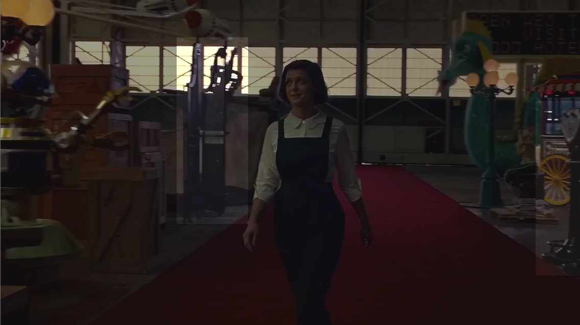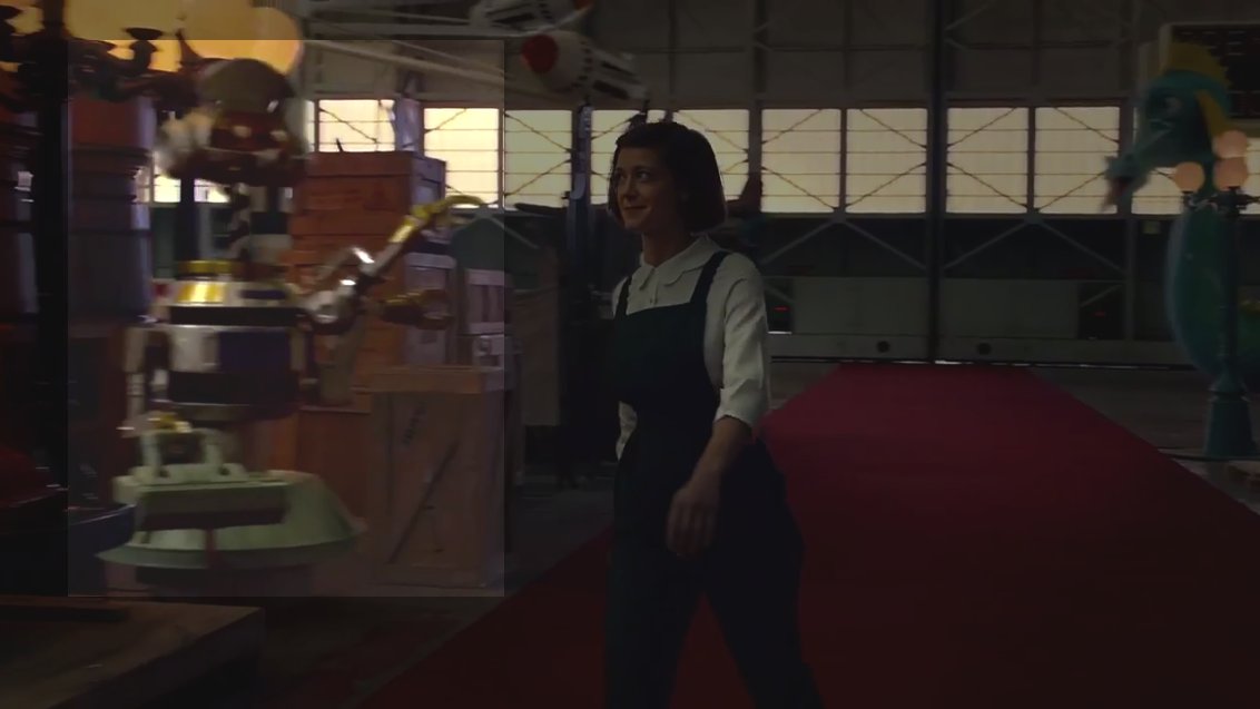 At just after ten seconds in to this thirty-second spot, the cast member takes a slightly baffling turn. As she pulls on her other glove she passes next to the princess gowns seen earlier (in the wide shot of the warehouse). The Rocket Jets should be in the background. Instead, there is now a large wall covered with vintage attraction posters.