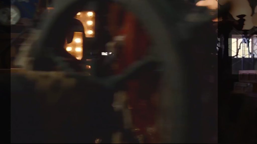 As the cast member continues into the warehouse, she momentarily is blocked from view by a large ship’s wheel in the foreground. The mossy appearance suggests that this is from the lower depths of the Pirates of the Caribbean. And over to the right of the screen one can catch a closer glimpse of the doors or screens seen in the wide shot. The style of these suggests something from Main Street, Frontierland, or New Orleans Square.