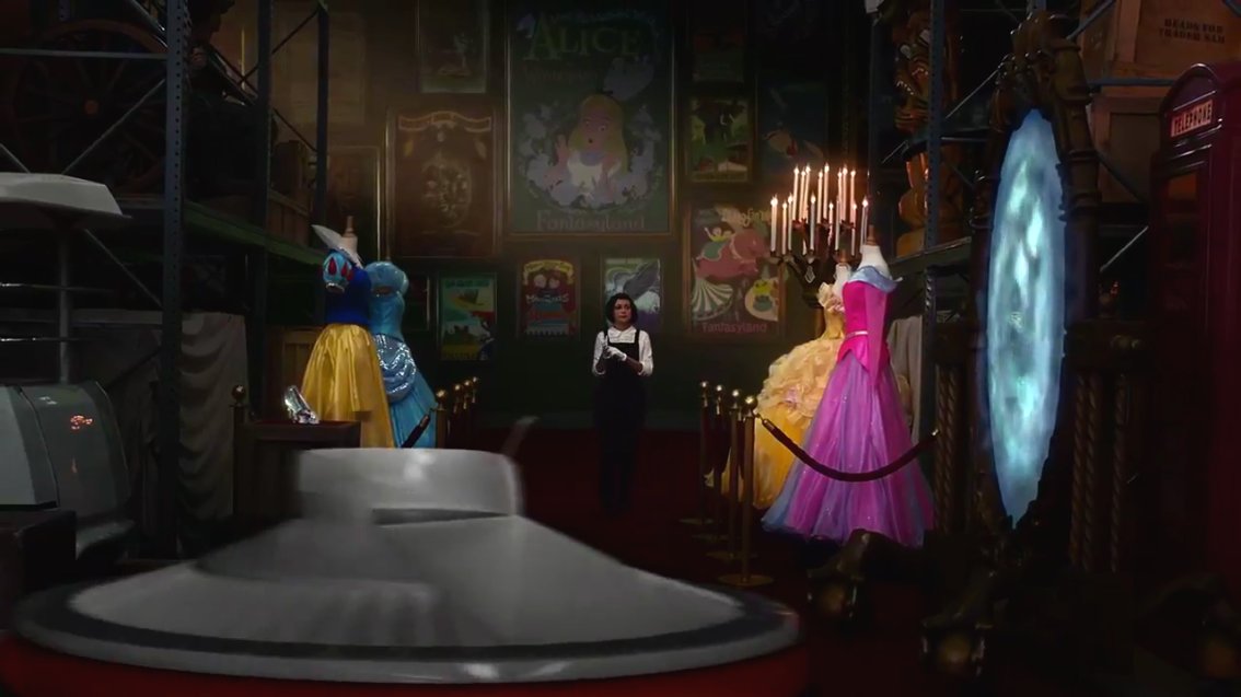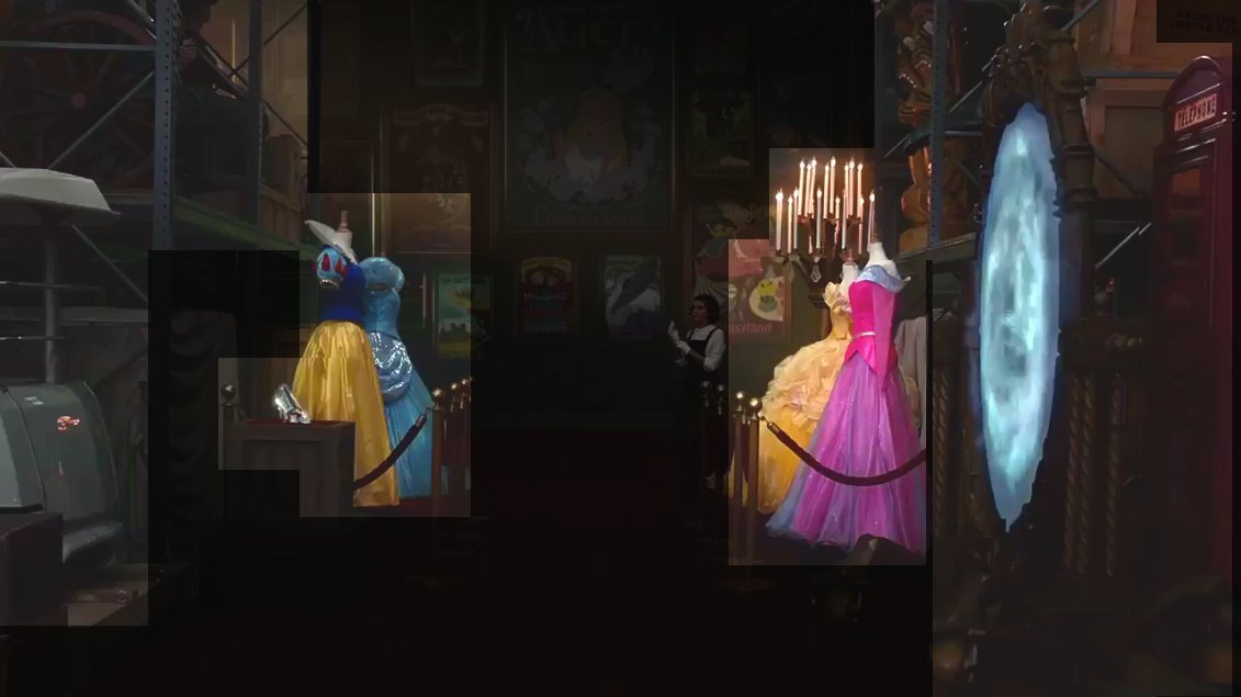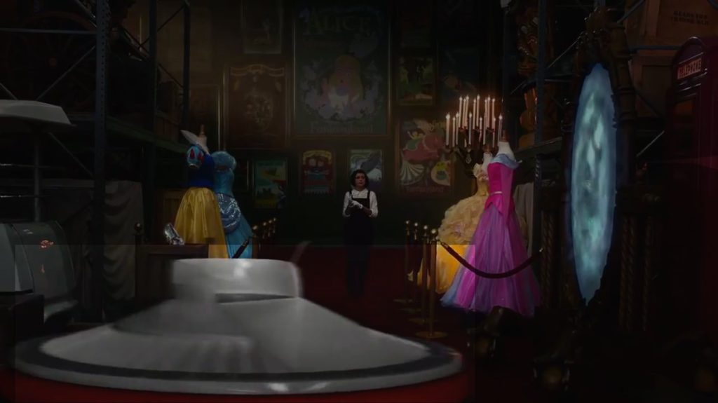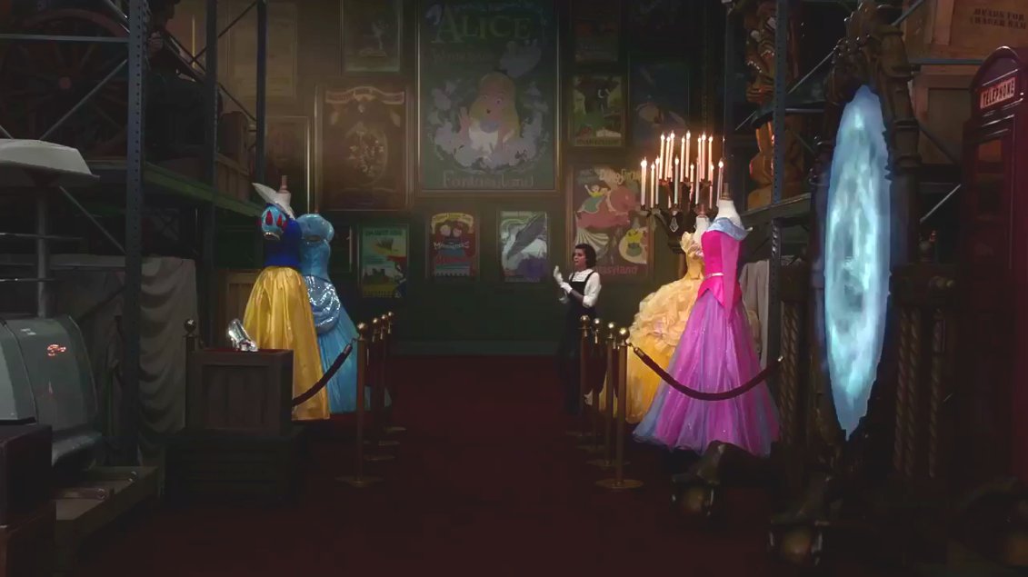 On the left of the screen can be seen Snow White’s gown, Cinderella’s gown, and a pair of her glass slippers. On the right are gowns for Belle and Sleeping Beauty (the pink one!). Also visible is a large candelabra (either from the loading area of the Haunted Mansion, or the ballroom sequence in the Christmas Fantasy Parade), a heavily framed magic mirror, and a properly British telephone booth. The Disneyland Hotel once featured a red booth for pay phones, and one also was “stored” in the Hollywood Picture Backlot in Disney California Adventure.