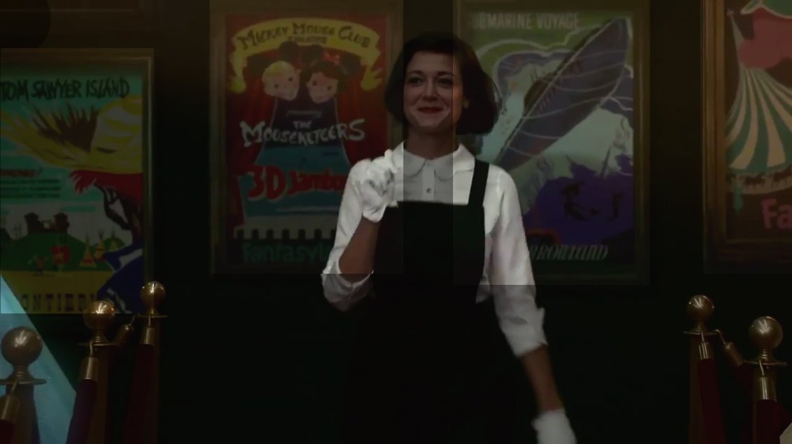 As she pulls on a glove, the cast member pays no mind to the draped People Mover (number 36), or the Tea Cup above.