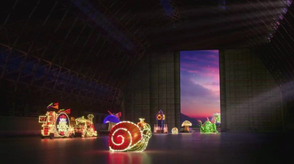 The spot ends with the Electrical Parade floats making their way out of the warehouse and into a perfect California dusk.