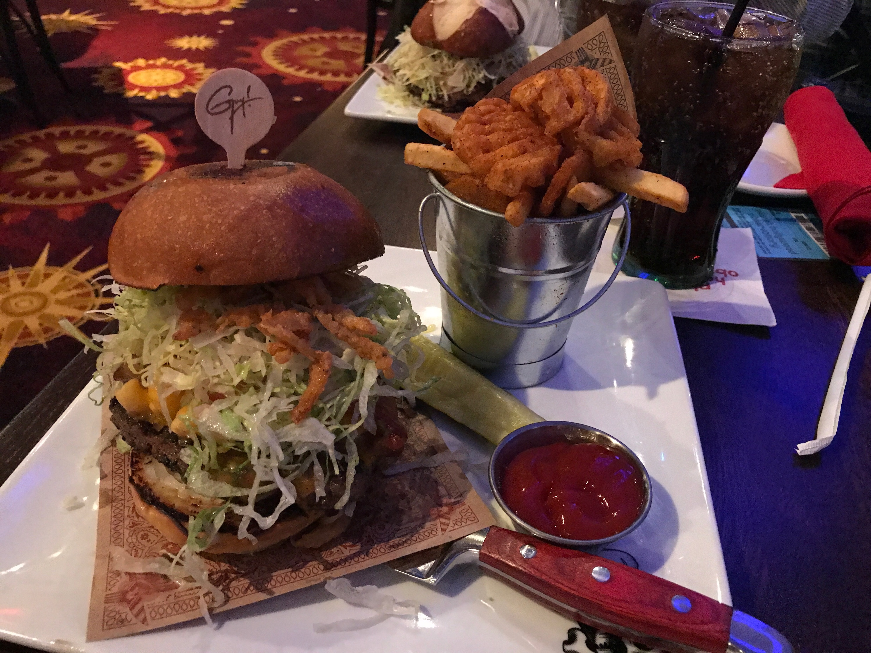 The menu has also been refreshed. While Classic Planet Hollywood options are still available, a line-up of burgers and sandwiches by celebrity chef Guy Fieri have been added. Thanks to a recommendation by our server Sara, we tried the Bacon Mac-N-Cheese which features applewood smoked back, six cheese mac-n-cheese, crispy onion straws, lettuce, tomato, onion, pickle & "donkey sauce" on a garlic-buttered brioche bun ($18.99) For those wondering "donkey sauce" is mayo, roasted garlic, mustard, Worcestershire, and s&p.