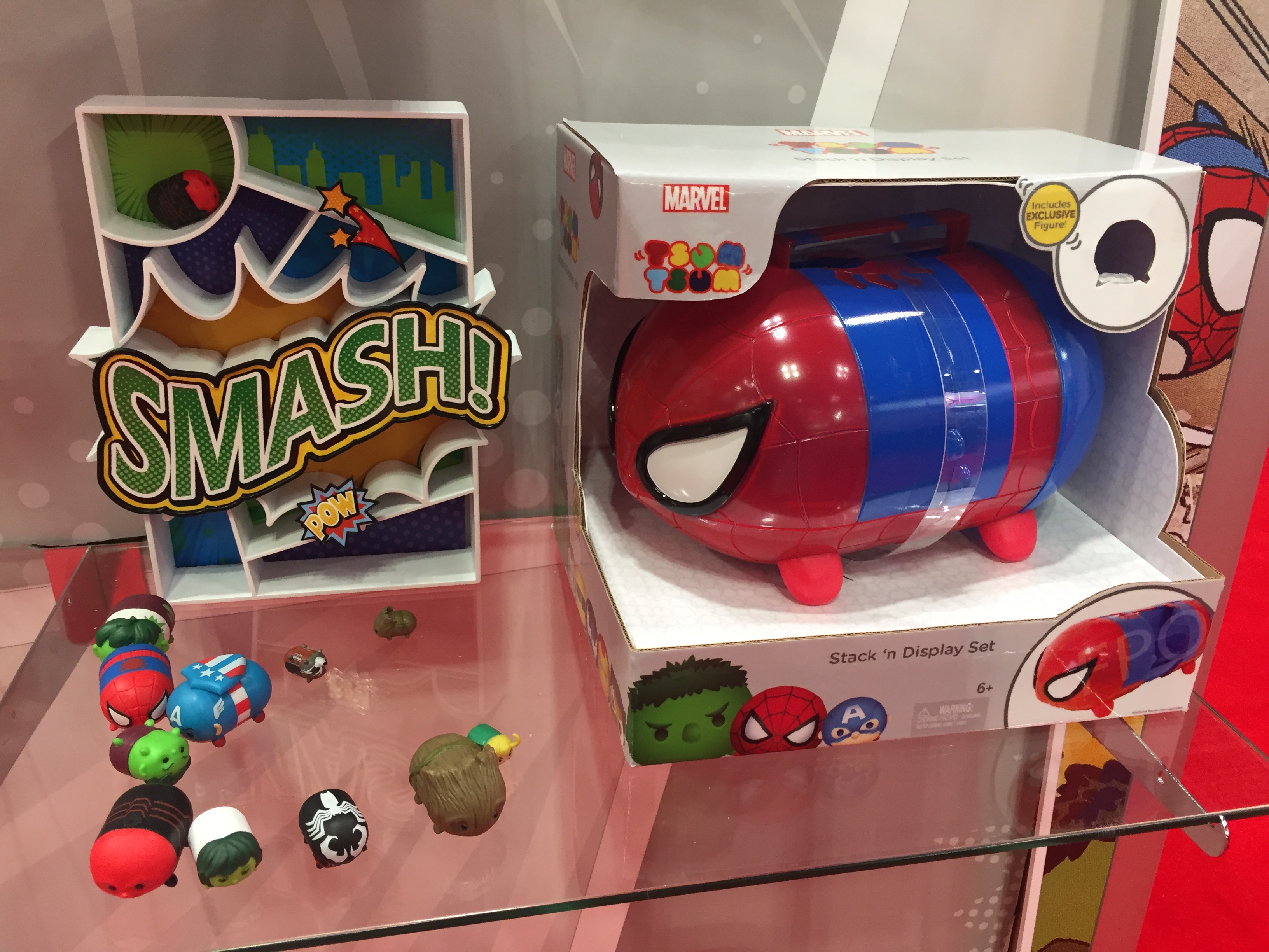 Last year at Toy Fair, Jakks Pacific debuted their new Marvel Tsum Tsum line and the Mickey Mouse carrying case. This year, the Marvel line expands with its own Spider-Man Stack 'n Display Set and the new Comic Box Display Set, that allows you to display your collection as if they are on the page of a Marvel Comic. The display set won't debut until this Fall, but the Spider-Man case is hitting shelves right now.
