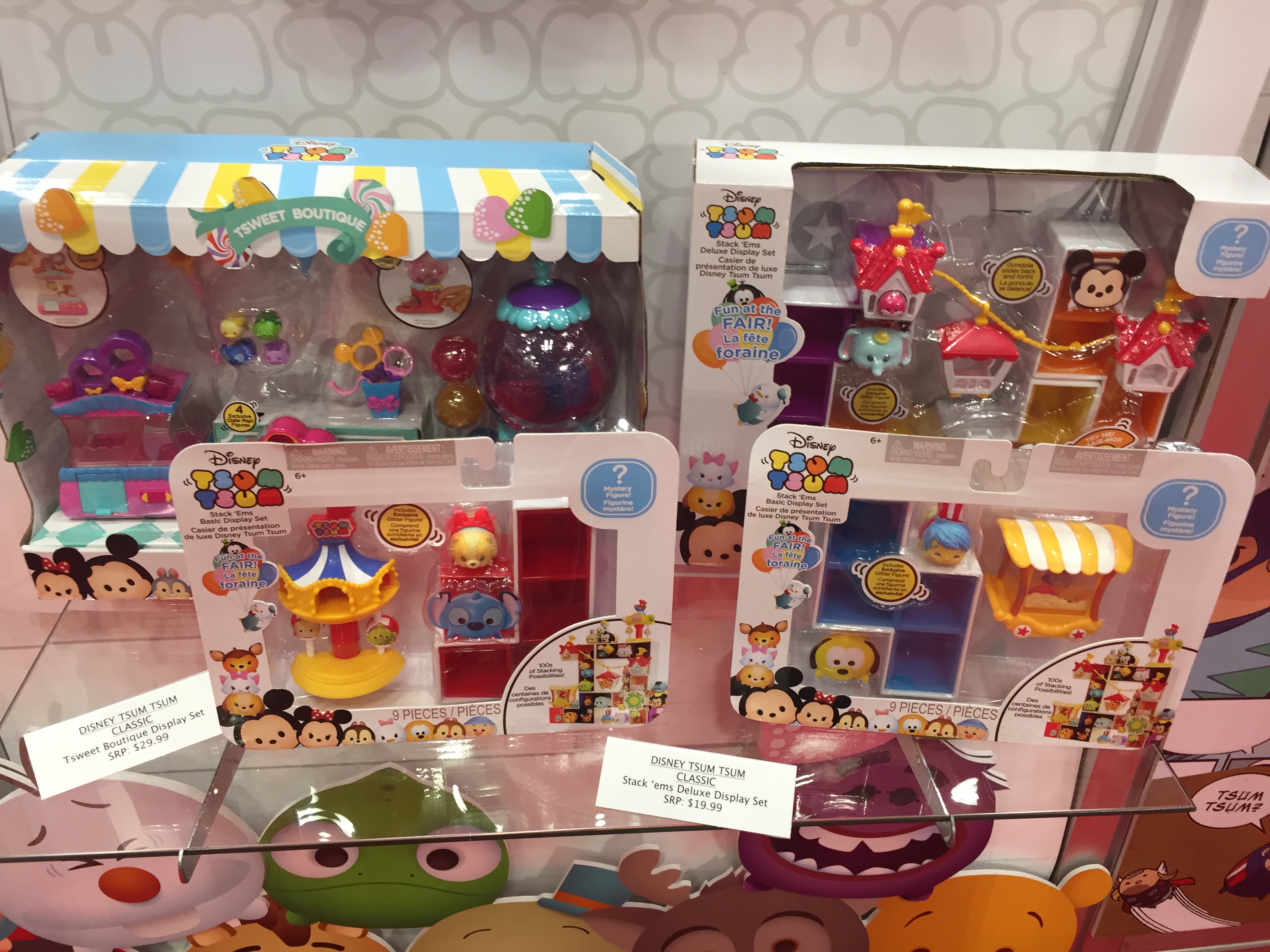 While the squishy and cuddly plush Tsum Tsums are exclusive to Disney and other licensees, Jakks Pacific produces the line of plastic collectables, which are available in multi-packs and blind-bag options. But first, I want to talk about the new play sets that are coming in the near future because these add a whole new element of fun and creativity to the line.The Tsum Tsum Tsweet Boutique is a fun way to display and play with your collection. It comes with 4 Color Pop figures, where each character features different shades of the same color, and has a working gumball machine for Tsum Tsums and a claw game that interacts with these figures. The Stack 'ems Deluxe Display Sets feature a theme called "Fun at the Fair!" which allows you to display your collection in a Disneyland-esque way.