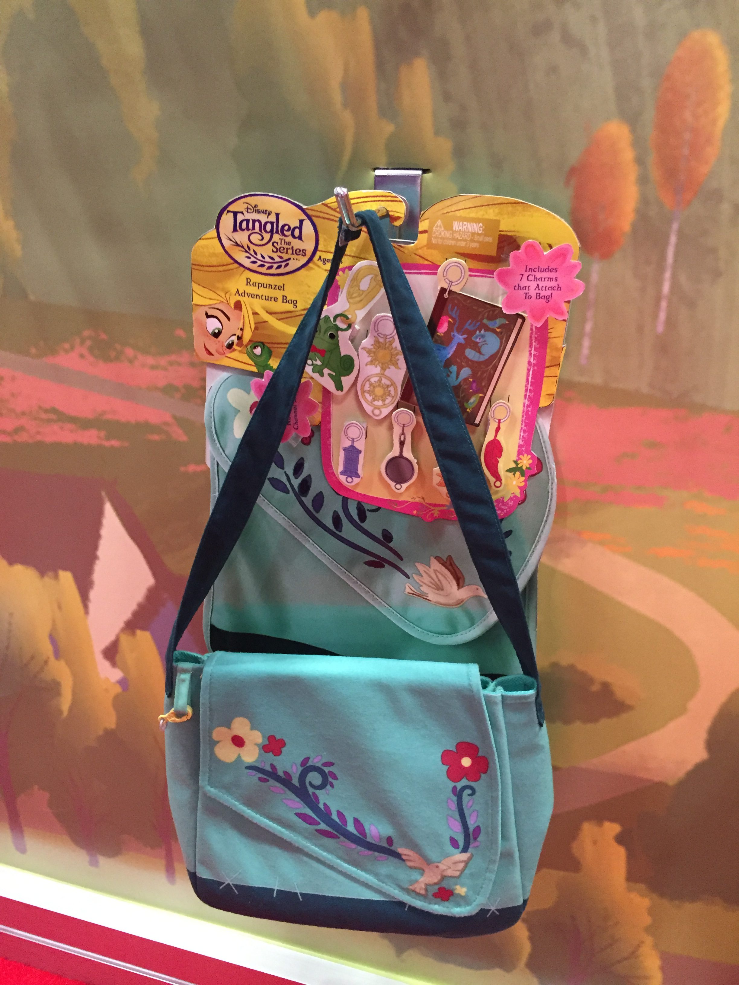 This prototype of Rapunzel's Adventure Bag will offer kids the ability to customize their bag with some included charms. The 7 included charms are Rapunzel's journal, Pascal, frying pan, flower, lanter, feather, and sun. It's big enough to hold the aforementioned journal, but could also be used as a way to keep the following set together.
