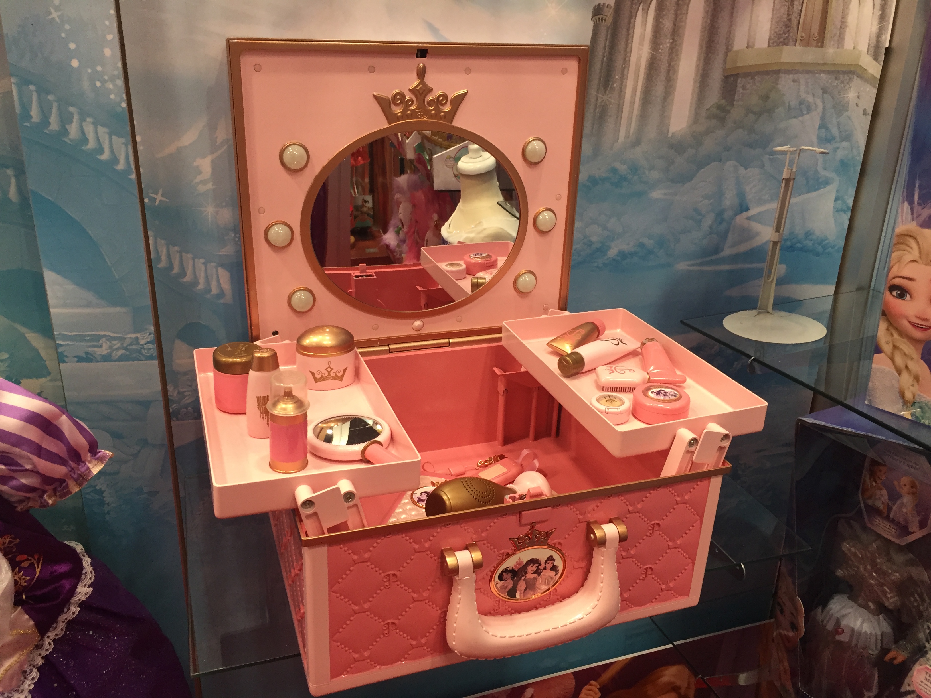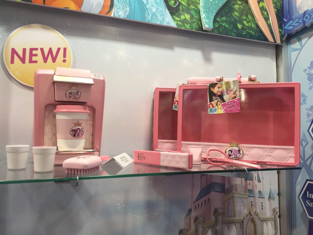 I came to New York City on a red eye flight and was pretty red eyed myself the entire weekend, so I just about drolled all over this pretend-play Disney Princess single-serve coffee maker. It's all part of a new modern and contemporary collection of pretend play items. Kids can be just like grown ups, but still live in a Disney fairytale with these rose gold finished toys. The coffee maker will be part of a bigger kitchen set and the empty cases next to it contained a mix of hair and makeup products, including a hairdryer that really blows air. The contents of these two cases had been emptied into...