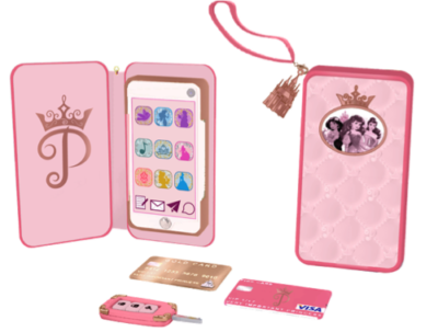 ... the Disney Princess Travel Vanity. The lights around the mirror are LEDs and the case has legs it can stand on when your little one isn't on the go. All of the cosmetic products are just make-believe, so they can put as much fake eyeshadow on as they like without actually becoming a painted lady. Another product in this line is so hysterically cute. Your kids can be just like mommy with this cellphone wristlet, with space for included car keys and chip-activated Visa cards.