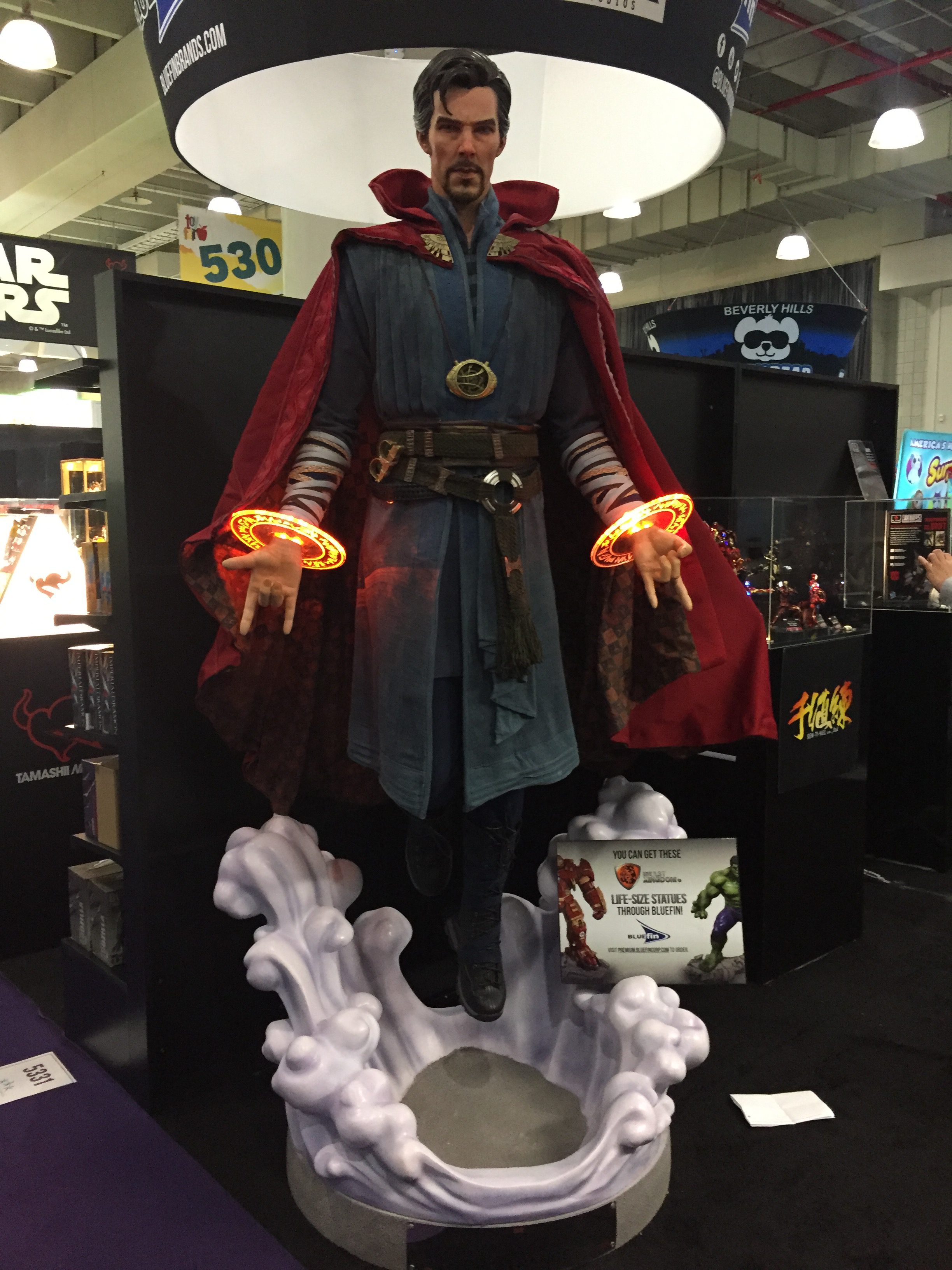 No, that's not Benedict Cumberbatch, I assume he was too busy to attend Toy Fair. But it is a life-size statue the likes of which rivals Madame Tussauds. His feet aren't connected to the base or the ground, giving him the realistic appearance of floating in midair. If you do a 360 degree circle, you will find that tiny, hard to locate a pipes connect through the extreme edges of his cape to his base. Obviously, this type of figure isn't for everybody. But if you have a home and a bank account that rivals Tony Stark, there's an entire catalogue of Marvel characters that you can collect. These include Iron Man, Captain America, Thor, Hulk, and Ant-Man. All of them come in their Marvel Studios looks and are modeled after the actors. This means that you, yes you, can have your own life size Chris Evans Captain America. You can put him in your grotto and visit him in secret. "Why Chris, this is all so... so sudden." On a serious note, if any of our readers do end up collecting these figures, please invite me over for a tour of your gallery.