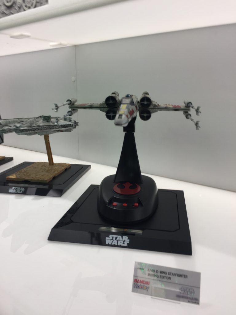 This X-Wing model is the first Moving Edition in the Bandai Star Wars model line. The buttons on the base connect to mechanisms inside the model that allow the wings to open and close. It also turns on lights in the engines and cockpit, and it makes sounds. This X-Wing model is based on The Force Awakens, but there are also classic X-Wing models that don't move.