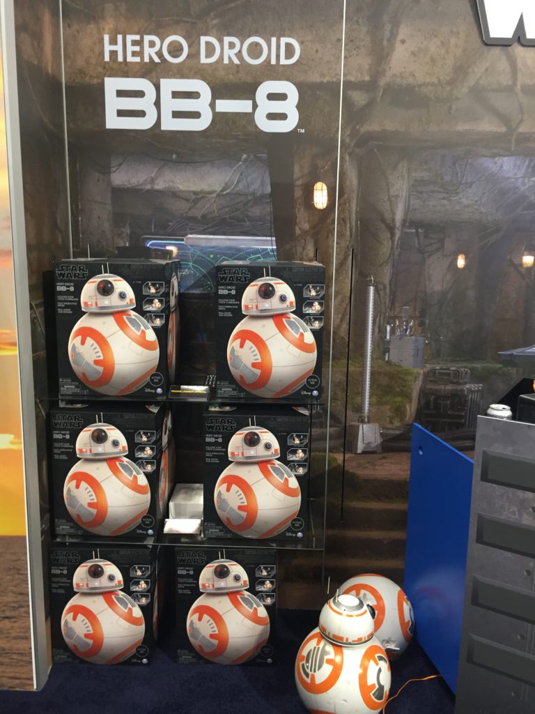 While visiting Spin Master, we got the chance to touch and interact with Hero Droid BB-8. He weighs about 8 pounds and is definitely aimed at an older audience, including adult Star Wars fans. There are also two play modes, the first uses a remote control where you can take full control over BB-8's actions. But the best component is the fact that this droid features voice recognition and can be trained to follow you wherever you go. He also reacts as BB-8 should when you talk about characters he knows. Mention Rey and he gets excited, but say the name "Kylo Ren" and he will find a good place to hide. To see a better demonstration of Hero Droid BB-8, check out our video preview from Toy Fair.