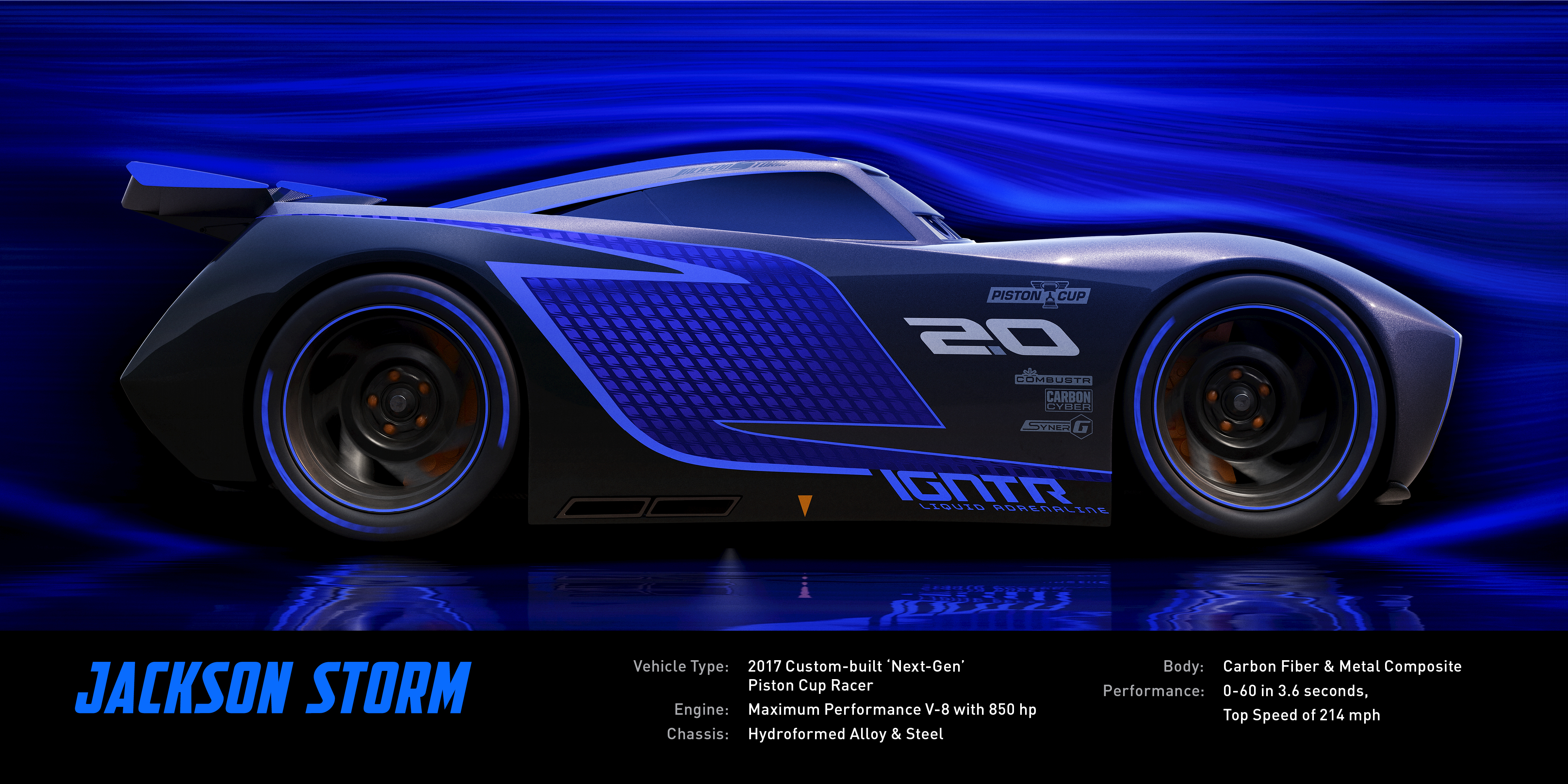 “Jackson Storm, if you think about it, is the inverse of McQueen in Cars,” explains writer Mike Rich. “He has everything that McQueen had when he was young. Speed, this personality, a lot of swagger, a little bit more of an edge than McQueen even had. But the one thing that he clearly represents is the same thing that McQueen represented to a lot of older racers when he was coming up. He can be the one that can take from Lighting the one thing that he loves more than anything in the world, racing.”